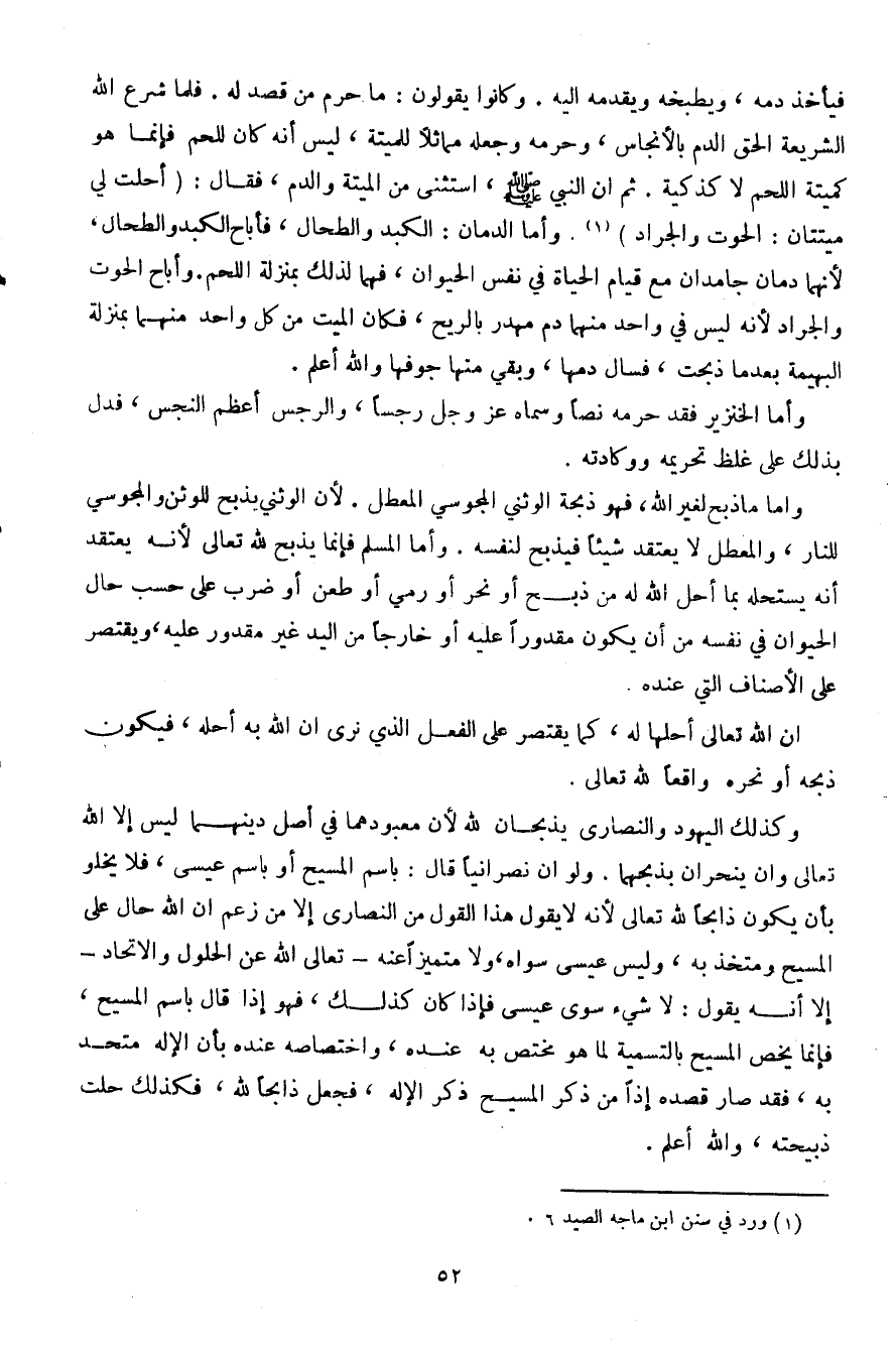 فيأخذ دمه، ويطبخه ويقدمه إليه. وكانوا يقولون: ما حرم من قصد له. فأما شرع الله الشريعة الحق الدم بالأنجاس، وحرمه وجعله مماثلا للميتة، ليس أنه كان للحم فإنما هو كميتة اللحم لا كذكية. ثم أن النبي صلى الله عليه وسلم، استثنى من الميتة والدم، فقال: (أحلت لي ميتتان: الحوت والجراد). وأما الدمان: الكبد والطحال، فأباح الكبد والطحال، لأنهما دمان جامدان مع قيام الحياة في نفس الحيوان، فهما لذلك بمنزلة اللحم. وأباح الحوت والجراد لأنه ليس في واحد منهما دم مهدر بالريح، فكان الميت من كل واحد منهما بمنزلة البهيمة بعدما ذبحت، فسال دمها، وبقي منها جوفها والله أعلم.