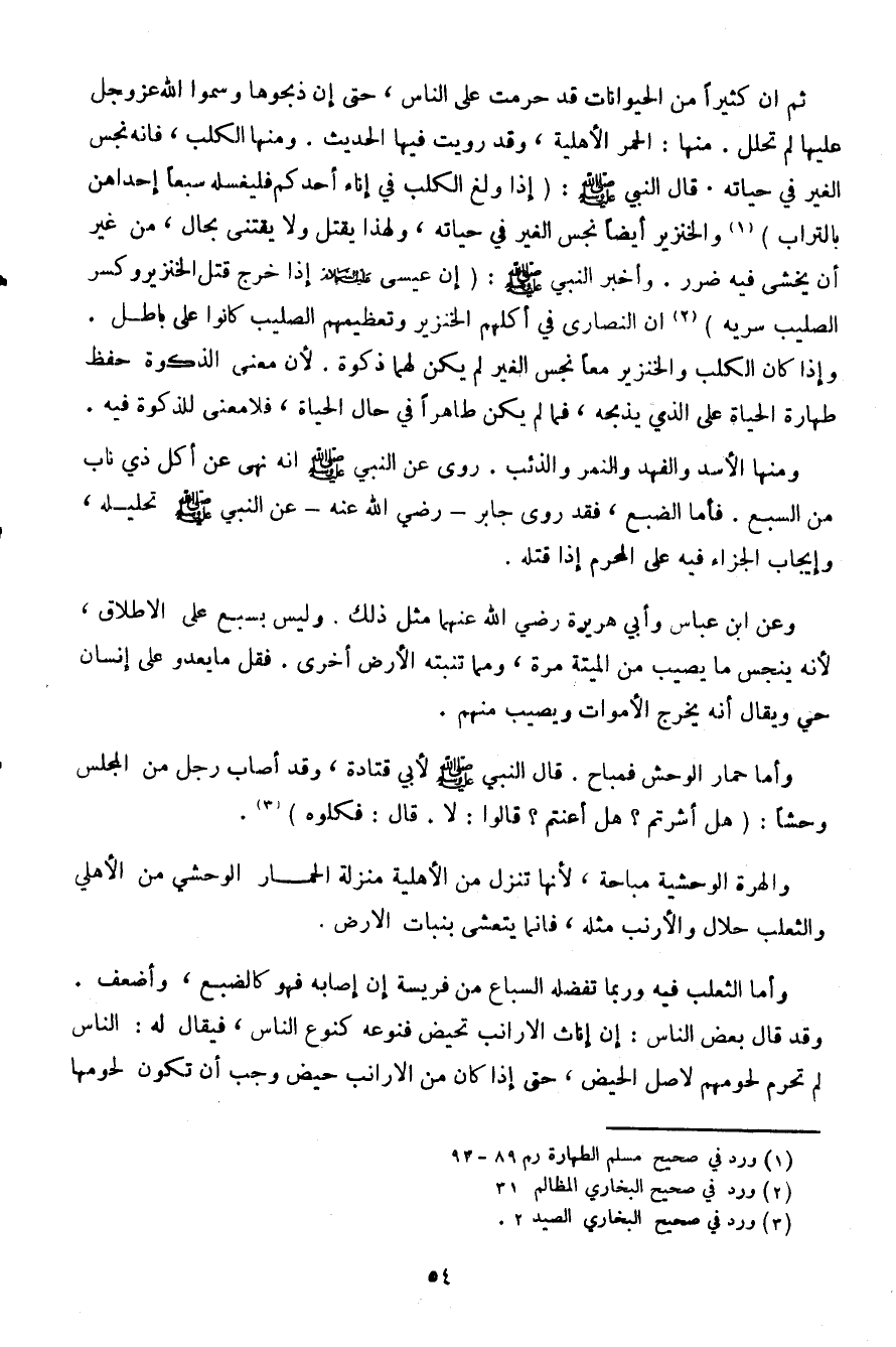 ثم إن كثيرا من الحيوانات قد حرمت على الناس، حتى إن ذبحوها وسموا الله عز وجل عليهم لم تحلل. منها: الحمر الأهلية، وقد رويت فيها الحديث. ومنها الكلب، فإنه نجس الغير في حياته. قال النبي صلى الله عليه وسلم: (إذا ولغ الكلب في إناء أحدكم فليغسله سبعا إحداهن بالتراب) والخنزير أيضا نجس الغير في حياته، ولهذا يقتل ولا يقتنى بحال، من غير أن يخشى فيه ضرر. وأخبر النبي صلى الله عليه وسلم: (إن عيسى عليه السلام إذا خرج قتل الخنزير وكسر الصليب سريه) أن النصارى في أكلهم الخنزير وتعظيمهم الصليب كانوا على باطل. وإذا كان الكلب والخنزير معا نجس الغير لم يكن لهما ذكوة. لأن معنى الذكوة حفظ طهارة الحياة على الذي يذبحه، فما لم يكن طاهرا في حال الحياة، فلا معنى للذكوة فيه.