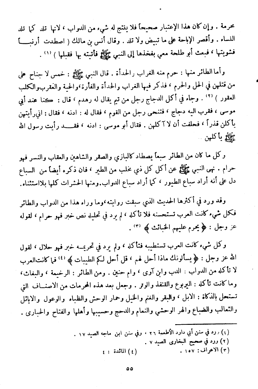 وكل شيء كانت العرب تستطيبه فتأكله، ولم يرد في تحريمه خبر فهو حلال، لقول الله عز وجل:} يسلونك ماذا أحل لهم، قل أحل لكم الطيبات {فما كانت العرب لا تأكله من الدواب: لدب وابن آوي، وأم حنين. ومن الطائر: الرخيمة، والبغاث، وما كانت تأكله: اليربوع والقنفذ والوتر. وجعل بعد هذه المحرمات من الأصناف التي تستحل بالذكاة: الإبل، والبقر والغنم والخيل وحمار الوحش والظباء والوعول والإيائل والثعالب والضبع والهر الوحشي والنعام والدحج وحسيبها وأهلها والفتاح والحباري.