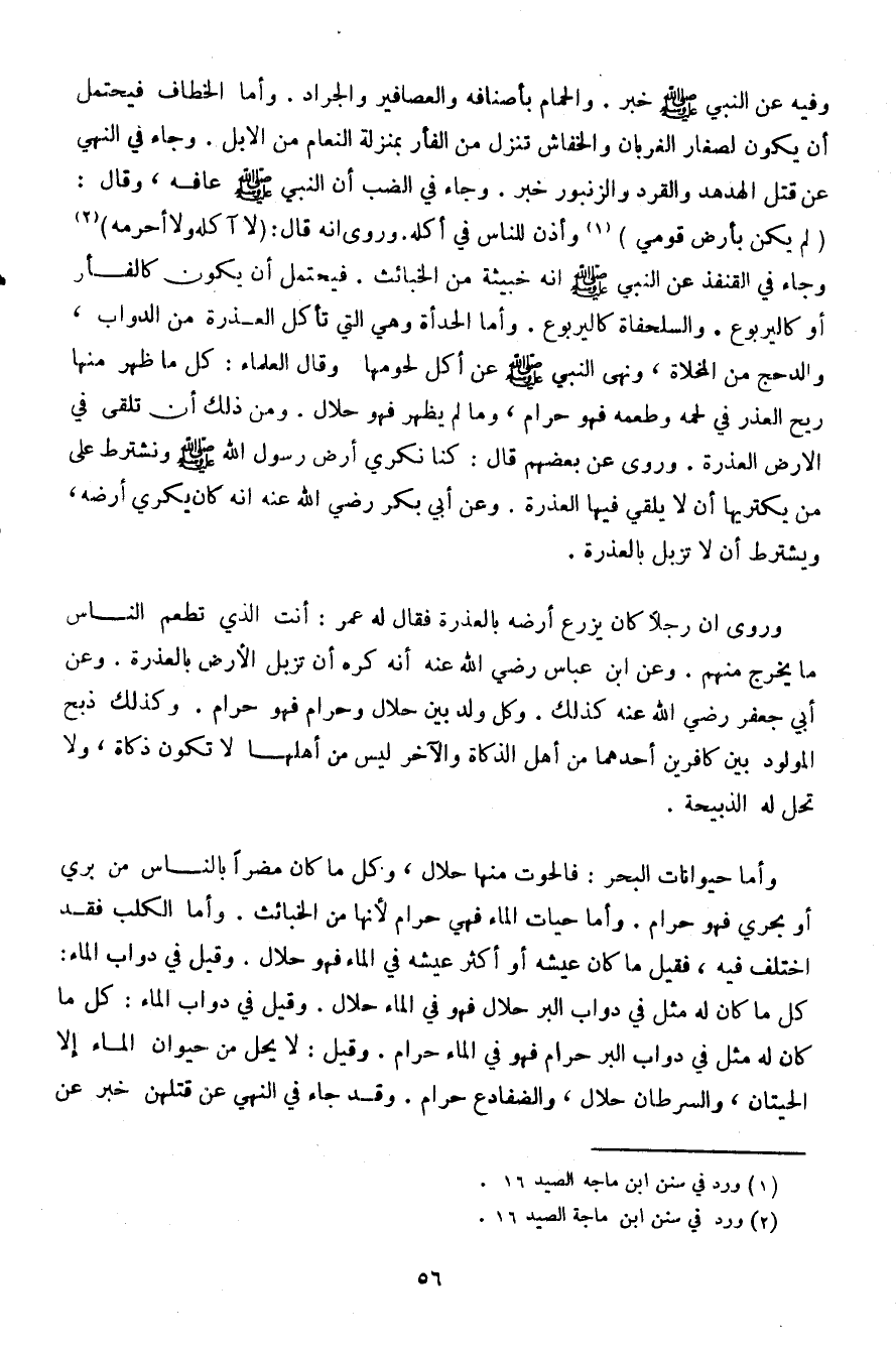 وفيه عن النبي صلى الله عليه وسلم خبر. والحمام بأصنافه والعصافير والجراد. وأما الخطاف فيحتمل أن يكون لصغر الغربان والخفاش تنزل من الفأر بمنزلة النعام من الإبل. وجاء في النهي عن قتل الهدهد والقرد والزنبور خبر. وجاء في الضب أن النبي صلى الله عليه وسلم عافه، وقال: (لم يكن بأرض قومي) وأذن للناس في أكله. وروى أنه قال: (لا آكله ولا أحرمه) وجاء في القنفذ عن النبي صلى الله عليه وسلم أنه خبيثة من الخبائث. فيحتمل أن يكون كالفأر أو كاليربوع. والسلحفاة كاليربوع. وأما الحدأة وهي التي تأكل العذرة من الدواب، والدحج من المخلاة، ونهى النبي صلى الله عليه وسلم عن أكل لحومها وقال العماء: كل ما ظهر منها ريح العذر في لحمه وطعمه فهو حرام، وما لم يظهر فهو حلال. ومن ذلك أن تلقى في الأرض العذرة. وروى عن بعضهم قال: كنا نكري أرض رسول الله صلى الله عليه وسلم ونشترط على من يكتريها أن لا يلقي فيها العذرة. وعن أبي بكر رضي الله عنه أنه كان يكري أرضه، ويشترط أن لا تزبل بالعذرة.