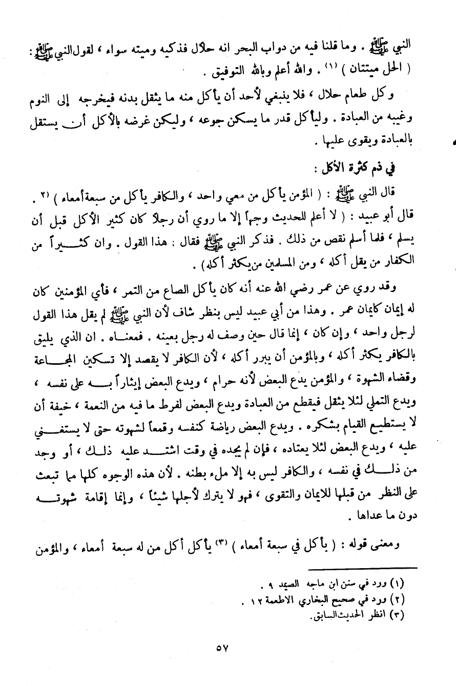 قال النبي صلى الله عليه وسلم: (المؤمن يأكل من معي واحد، والكافر يأكل من سبعة أمعاء). قال أبو عبيد: (لا أعلم للحديث وجها إلا ما روي أن رجلا كان كثير الأكل قبل أن يسلم، فلما أسلم نقص من ذلك. فذكر النبي صلى الله عليه وسلم فقال: هذا القول. وإن كثيرا من الكفار من يقل أكله، ومن المسلمين من يكثر أكله).