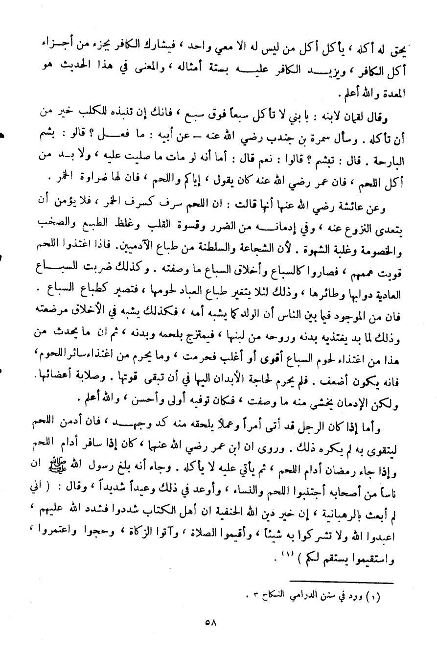 وعن عائشة رضي الله عنها أنها قالت: إن اللحم سرف كسرف الخمر، فلا يؤمن أن يتعدى النزوع عنه، وفي إدمانه من الضرر وقسوة القلب وغلظ الطبع والصخب والخصومة وغلبة الشهور. لأن الشجاعة والسلطنة من طباع الآدميين. فإذا اعتذوا اللحم قويت هممهم، فصاروا كالسباع وأخلاق السباع ما وصفته. وكذلك ضربت السباع العادية دوابها وطائرها، وذلك لئلا يتغير طباع العباد لحومها، فتصير كطباع السباع.