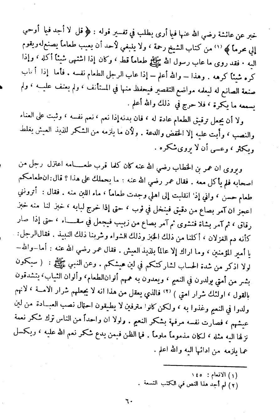 ويروي أن عمر بن الخطاب رضي الله عنه كان كلما قرب طعامه اعتزل رجل من أصحابه فلم يأكل معه. فقال عمر رضي الله عنه: ما يحملك على هذا؟ قال: إن طعامكم طعام حسن، وإني إذا انقلبت إلى أهلي وجدت طعاما، ماء اللبن منه. فقال: أترونني أعجز أن آمر بصاع من دقيق فينخل في ثوب، حتى إذا خرج لبابه، خبز لنا منه خبز رقاق، ثم آمر بشاة فتشوى ثم آمر بصاع من زبيب فيجعل في سقاء، حتى إذا صار كأنه دم الغزلان، أكلنا من ذلك الخبز وذلك الشواء وشربنا ذلك النبيذ. فقال الرجل: يا أمير المؤمنين، وما أراك إلا عالما بلذيذ العيش. فقال عمر رضي الله عنه: أما- والله- لولا اذكر من شدة الحساب لشاركتكم في لين عيشكم. وعن النبي صلى الله عليه وسلم: (سيكون بشر من أمتي يولودون في النعيم، ويعدون به همهم ألوان الطعام، وألوان الثياب، يتشدقون بالقول، أولئك شرار أمتي) فالذي يعقل من هذا أنه لا يجعلهم شرار الأمة، لأنهم ولدوا في النعيم وغذوا به، ولكن كانوا مترفين لا يطيقون احتمال نصب العبادة من لين عيشهم، فصارت نفسه مرفهة بشكر النعيم. ولولا أن واحدا من الناس ترك شكر نعمة نزلها إليه مثله، لكان مذموما ملوما. فما الظن فيمن يدع شكر نعم الله عليه، ويكسل عما يلزمه من أدائها إليه والله أعلم.