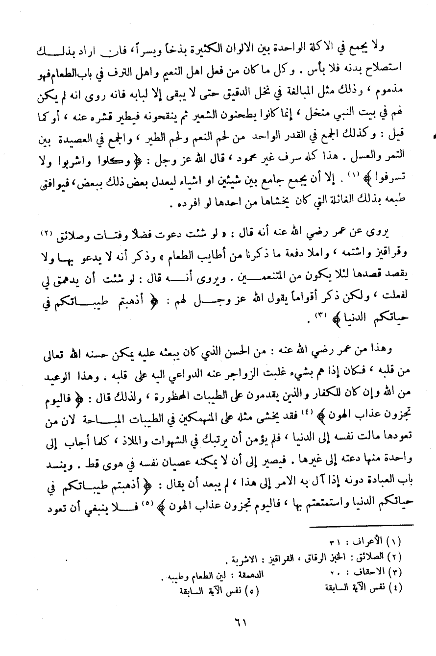 يروى عن عمر رضي الله عنه أنه قال: "لو شئت دعوت فضلا وفتات وصلائق وقراقيز واشتمه، وأملا دفعه ما ذكرنا من أطايب الطعام" وذكر أنه لا يدعو بها ولا يقصد قصدها لئلا يكون من المتنعمين. ويروي أنه قال: لو شئت أن يدهمق لي لفعلت، ولكن ذكر أقواما يقول الله عز وجل لهم:} أذهبتم طيباتكم في حياتكم الدنيا {.