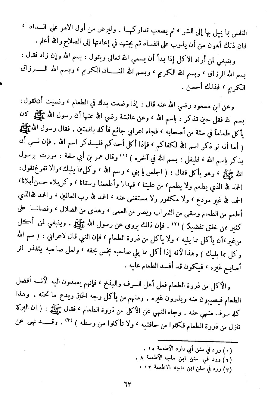 وعن ابن مسعود رضي الله عنه قال: إذا وضعت يدك في الطعام، ونسيت أن تقول: بسم الله فقل حين تذكر: باسم الله، وعن عائشة رضي الله عنها أن رسول الله صلى الله عليه وسلم كان يأكل طعاما في ستة من أصحابه، فجاء أعرابي جائع فأكله بلقمتين. فقال رسول الله صلى الله عليه وسلم (أما أنه لو ذكر اسم الله لكفاكم، فإذا أكل أحدكم فليذكر اسم الله. فإن نسي أن يذكر باسم الله، فليقل: بسم الله في آخره) وقال عمر بن أبي سلمة: مررت برسول الله صلى الله عليه وسلم، وهو يأكل فقال: (اجلس يا بني، وسم الله، وكل مما يليك، وإلا تفرغ تقول: الحمد لله الذي يطعم ولا يطعم، من علينا، فهداما وأطعمنا وسقانا، وكل بلاء حسن أبلانا، الحمد لله غير مودع، ولا مكفور ولا مستغني عنه، الحمد لله رب العالمين، والحمد لله الذي أطعم من الطعام وسقى من الشرااب وبصر من العمى، وهدى من الضلال، وفضلنا على كثير ممن خلق تفضيلا). فإن ذلك يروي عن رسول الله صلى الله عليه وسلم. وينبغي لمن أكل من غير، أن يأكل مما يليه، ولا يأكل من ذروة الطعام، فإن النبي قال لأعرابي: (سم الله وكل مما يليك) وهذا لأنه إذا أكل مما يلي صاحبه بخس بحقه، ولعل صاحبه يتقذر أثر أصابع غيره، فيكون قد أفسد الطعام عليه.