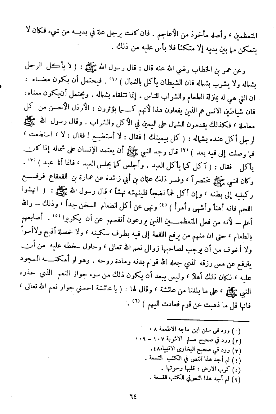 وعن عمر بن الخطاب رضي الله عنه قال: قال رسول الله صلى الله عليه وسلم: (لا يأكل الرجل بشماله ولا يشرب بشماله فإن الشيطان يأكل بالشمال). فيحتمل أن يكون معناه: أن التي هي له بمنزلة الطعام والشراب للناس. إنما تتلقاه بشماله. ويحتمل أن يكون معناه: فإن شياطين الإنس هم الذين يفعلون هذاا لأنهم كما يؤثرون: الأرذل الأحسن من كل معاملة، فكذلك يقدمون الشمال على اليمين في الأكل والشراب. وقال رسول الله صلى الله عليه وسلم لرجل أكل عنده بشماله: (كل بيمينك! فقال: لا أستطيع! فقل: لا استطعت، فما وصلت إلى فيه بعد) قال وجد النبي صلى الله عليه وسلم أن يعتمد الإنسان على شماله إذا كان يأكل فقال: (آكل كم يأكل العبد. وأجلس كما يجلس العبد، فإنما أنا عبد). وكان النبي صلى الله عليه وسلم مختصرا، وفسر ذلك عثمان بن أبي زائدة عن عمارة بن القعقاع فرفع ركبتيه إلى بطنه، وإن أكل لحما نضجا فلينهشه نهشا، قال رسول الله صلى الله عليه وسلم: (انهشوا اللحم فإنه أهنأ وأشهى وأمرأ) ونهى عن أكل الطعام السخن جدا، وذلك- والله أعلم- لأنه من فعل المتعظمين الذين يروعون أنفسهم عن أن يكربوا. أصبعهم بالطعام، حتى إن منهم من يرفع اللقمة إلى فيه بطرف سكينه، ولا خصلة أقبح ولا أسوأ ولا أخوف من أن يوجب لصاحبها زوال نعم الله تعالى، وحلول سخطه عليه من أن يترفع عن مس رزقه الذي جعله الله قوام بدنه ومادة روحه. وهو لو أمكنه السجود عليه، لكان ذلك أهل، وليس يبعد أن يكون ذلك من سوء جواز النعم الذي حذره النبي صلى الله عليه وسلم، على ما بلغنا من عائشة، وقال لها: (يا عائشة احسني جوار نعم الله تعالى، فإنها قل ما ذهبت عن قوم فعادت إليهم).