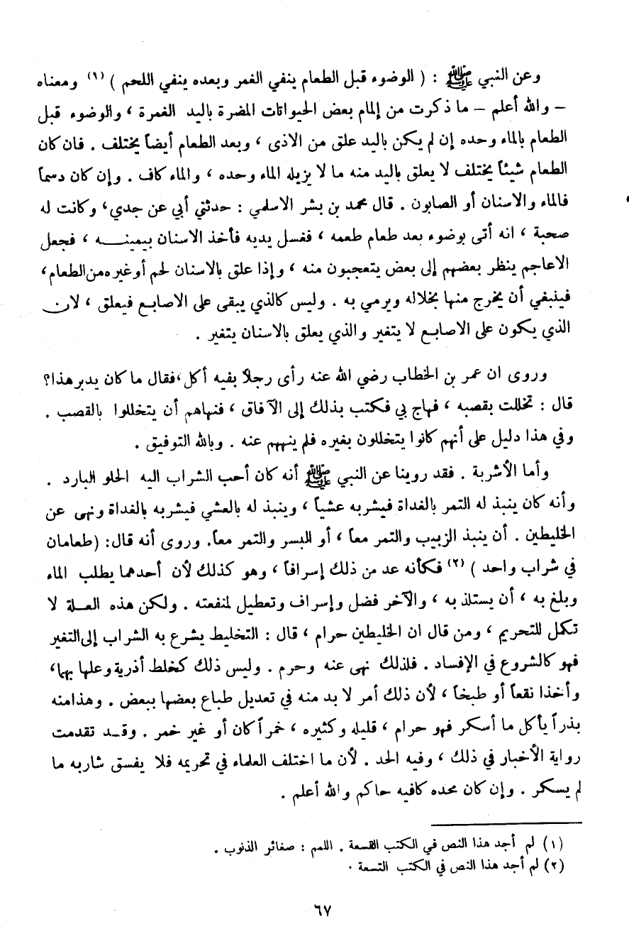 وأما الأشربة. فقد روينا عن النبي صلى الله عليه وسلم أنه كان أحب الشراب إليه الحلو البارد. وأنه كان ينبذ له التمر بالغدة فيشربه عشيا، وينبذ له بالعشي فيشربه بالغداة ونهى عن الخليطين. أن ينبذ الزبيب والتمر معا، أو البسر والتمر معا. وروى أنه قال: (طعامان في شرب واحد) فكأنه عد من ذلك إسرافا، وهو كذلك لأن أحدهما يطلب الماء وبلغ به، أن يستلذ به، والآخر فضل وإسراف وتعطيل لمنفعته. ولكن هذه العلة لا تكمل للتحريم، ومن قال أن الخليطين حرام، قال: التخليط يشرع به الشراب إلى التغير فهو كالشروع في الإفساد. فلذلك نهى عنه وحرم. وليس ذلك كخلط أذرية وعلها بهما، وأخذا نقعا أو طبخا، لأن ذلك أمر لا بد منه في تعديل طباع بعضها ببعض. وهذا منه بذرا يأكل ما أسكر فهو حرام، قليله وكثيره، خمر كان أو غير خمر. وقد تقدمت رواية الأخبار في ذلك، وفيه الحد. لأن ما اختلف العلماء في تحريمه فلا يفسق شاربه ما لم يسكر. وإن كان محده كافيه حاكم والله أعلم.