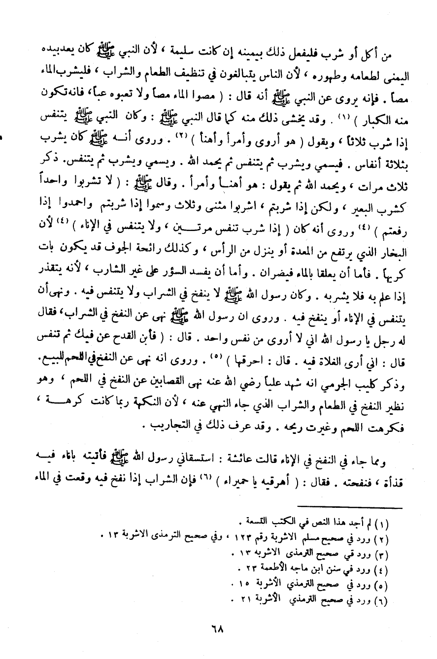 من أكل أو شرب فليفعل ذلك بيمينه إن كانت سليمة، لأن النبي صلى الله عليه وسلم كان يعد بيده اليمنى لطعامه وطهوره، لأن الناس يتبالغون في تنظيف الطعام والشراب، فليشرب الماء مصا. فإنه يروي عن النبي صلى الله عليه وسلم أنه قال: (مصوا الماء مصا ولا تعبوه عبا، فإنه تكون منه الكبار) وقد يخشى ذلك منه كما قال النبي صلى الله عليه وسلم: وكان النبي صلى الله عليه وسلم يتنفس إذا شرب ثلاثا، ويقول (هو أوى وأمرأ وأهنأ). وروى أنه صلى الله عليه وسلم كان يشرب بثلاثة أنفاس. فيسمي ويشرب ثم يتنفس ثم يحمد الله. ويسمي ويشرب ثم يتنفس. ذكر ثلاث مرات، ويحمد الله ثم يقول: هو أهنأ وأمرأ. وقال صلى الله عليه وسلم: (لا تشربوا واحدا كشرب البعير، ولكن إذا شربتم، اشربوا مثنى وثلاث وسموا إذا شربتم واحمدوا إذا رفعتم) وروى أنه كان (إذا شرب تنفس مرتين، ولا يتنفس في الإناء) لأن البخار الذي يرتفع من المعدة أو ينزل من الرأس، وكذلك رائحة الجوف قد يكون بات كريها. فأما أن يعلقا بالماء فيضران. وأما أن يفسد السؤر على غير الشارب، لأنه يتقذر إذا علم به فلا يشربه. وكان رسول الله صلى الله عليه وسلم لا ينفخ في الشراب ولا يتنفس فيه. ونهى أن يتنفس في الإناء أو ينفخ فيه. وروى أن رسول الله صلى الله عليه وسلم نهى عن النفخ في الشراب، فقال له رجل يا رسول الله إني لا أروي من نفس واحد. قال: (فأبن القدح عن فيك ثم تنفس قال: إني أرى الغلاة فيه. قال: احرقها). وروى أنه نهى عن النفخ في اللحم للبيع. وذكر كليب الجرمي أنه شهد عليا رضي الله عنه نهى القصابين عن النفخ في اللحم، هو نظير النفخ في الطعام والشراب الذي جاء النهي عنه، لأن النكهة ربما كانت كرهة، فكرهت اللحم وغيرت ريحه. وقد عرف ذلك في التجاريب.
