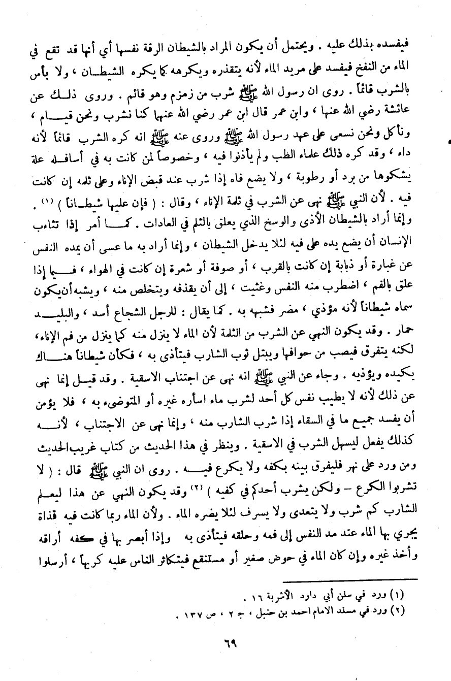 فيفسده بذلك عليه. ويحتمل أن يكون المراد بالشيطان لرقة نفسها أي أنها قد تقع في الماء من النفخ فيفسد على مريد الماء لأنه يتقذره ويكرهه كما يكره الشيطان، ولا بأس بالشرب قائما. روى أن رسول الله صلى الله عليه وسلم شرب من زمزم وهو قائم. وروى ذلك عن عائشة رضي الله عنها، وابن عمر قال ابن عمر رضي الله عنهما كنا نشرب ونحن قيام، ونأكل ونحن نسعى على عهد رسول الله صلى الله عليه وسلم وروى عنه صلى الله عليه وسلم أنه كره الشرب قائما لأنه داء، وقد كره ذلك علماء الطب ولم يأذنو فيه، وخصوصا لمن كانت في أسافله علة يشكوها من برد أو رطوبة، ولا يضع فاه إذا شرب عند قبض الإناء وعلى ثلمه إن كانت فيه. لأن النبي صلى الله عليه وسلم نهى عن الشرب في ثلمة الإناء، وقال: (فإن عليها شيطانا). وإنما أراد بالشيطان الأذى والوسخ الذي يعلق بالثلم في العادات. كما أمر إذا تثاءب الإنسان أن يضع يده على فيه لئلا يدخل الشيطان، وإنما أرد به ما عسى أن يمده النفس عن غبارة أو ذبابة إن كانت بالقرب، أو صوفة أو شعرة إن كانت في الهواء، فيما إذا علق بالفم، اضطرب منه النفس وغثيث، إلى أن يقذفه ويتخلص منه، ويشبه أن يكون سماه شيطانا لأنه مؤذي، مضر فشبهه به. كما يقال: للرجل الشجاع أسد، والبليد حمار. وقد يكون النهي عن الشرب من الثلمة لأن الماء لا ينزل منه كما ينزل من فم الإناء، لكنه يتفرق فيصب من حوافها ويبتل ثوب الشارب فيتأذى به، فكأن شيطانا هناك يكيده ويؤذيه. وجاء عن النبي صلى الله عليه وسلم أنه نهى عن اجتناب الأسقية. وقد قيل إنما نهى عن ذلك لأنه لا يطيب نفس كل أحد لشرب ماء اسأره غيره أو المتوضئ به، فلا يؤمن أن يفسد جميع ما في السقاء إذا شرب الشارب منه، وإنما نهى عن الاجتناب، لأنه كذلك يفعل ليسهل الشرب في الأسقية. وينظر في هذا الحديث من كتب غريب الحديث ومن ورد على نهر فليفرق بينه بكفه ولا يكرع فيه. روى أن النبي صلى الله عليه وسلم قال: (لا تشربوا الكرع- ولكن يشرب أحدكم في كفيه) وقد يكون النهي عن هذا ليعلم الشارب كم شرب ولا يتعدى ولا يسرف لئلا يضره الماء. ولأن الماء ربما كانت فيه قذاة يجري بها الماء عند مد النفس إلى فمه وحلقه فيتأذى به وإذا أبصر بها في كفه أراقه وأخذ غيره وإن كان الماء في حوض صغير أو مستنقع فيتكاثر الناس عليها كريهاً، أرسلوا