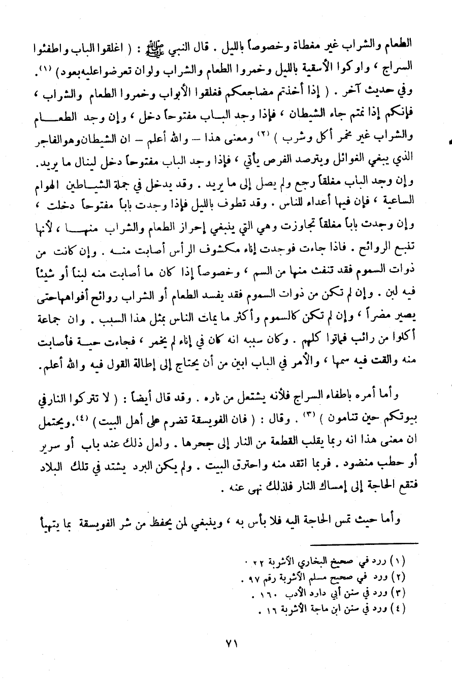 الطعام والشراب غير مغطاة وخصوصا بالليل. قال النبي صلى الله عليه وسلم: (أغلقوا الباب وأطفئوا السراج، وأوكوا الأسقية بالليل وخمروا الطعام والشراب ولو أن تعرضوا عليه بعود). وفي حديث آخر. (إذا أخذتم مضاجعكم فغلقوا الأبواب وخمروا الطعام والشراب، فإنكم إذا نمتم جاء الشيطان، فإذا وجد الباب مفتوحا دخل، وإن وجد الطعام والشراب غير مخمر أكل وشرب) ومعنى هذا- والله أعلم- إن الشيطان وهو الفاجر الذي يبغي الغوائل ويترصد الفرص يأتي، فإذا وجد الباب مفتوحا دخل لينال ما يريد وإن وجد الباب مغلقا رجع ولم يصل إلى ما يريد. وقد يدخل في جملة الشياطين الهوام الساعية، فإن فيها أعداء للناس. وقد تطوف بالليل فإذا وجدت بابا مفتوحا دخلت، وإن وجدت بابا مغلقا تجاوزت وهي التي ينبغي إحراز الطعام والشراب منها، لأنها تنبع الروائح. فإذا جاءت فوجدت إناء مكشوف الرأس أصابت منه. وإن كانت من ذوات السموم فقد تنفث منها من السم، وخصوصا إذا كان ما أصابت منه لبنا أو شيئا فيه لبن. وإن لم تكن من ذوات السموم فقد يفسد الطعام أو الشراب روائح أفواهها حتى يصير مضرا، وإن لم تكن كالسموم وأكثر ما يمات الناس بمثل هذا السبب. وإن جماعة أكلوا من رائب فماتوا كلهم. وكان سببه أنه كان في إناء لم يخمر، فجاءت حية فأصابت منه وألقت فيه سمها، والأمر في الباب أبين من أن يحتاج إلى إطالة القول فيه والله أعلم.