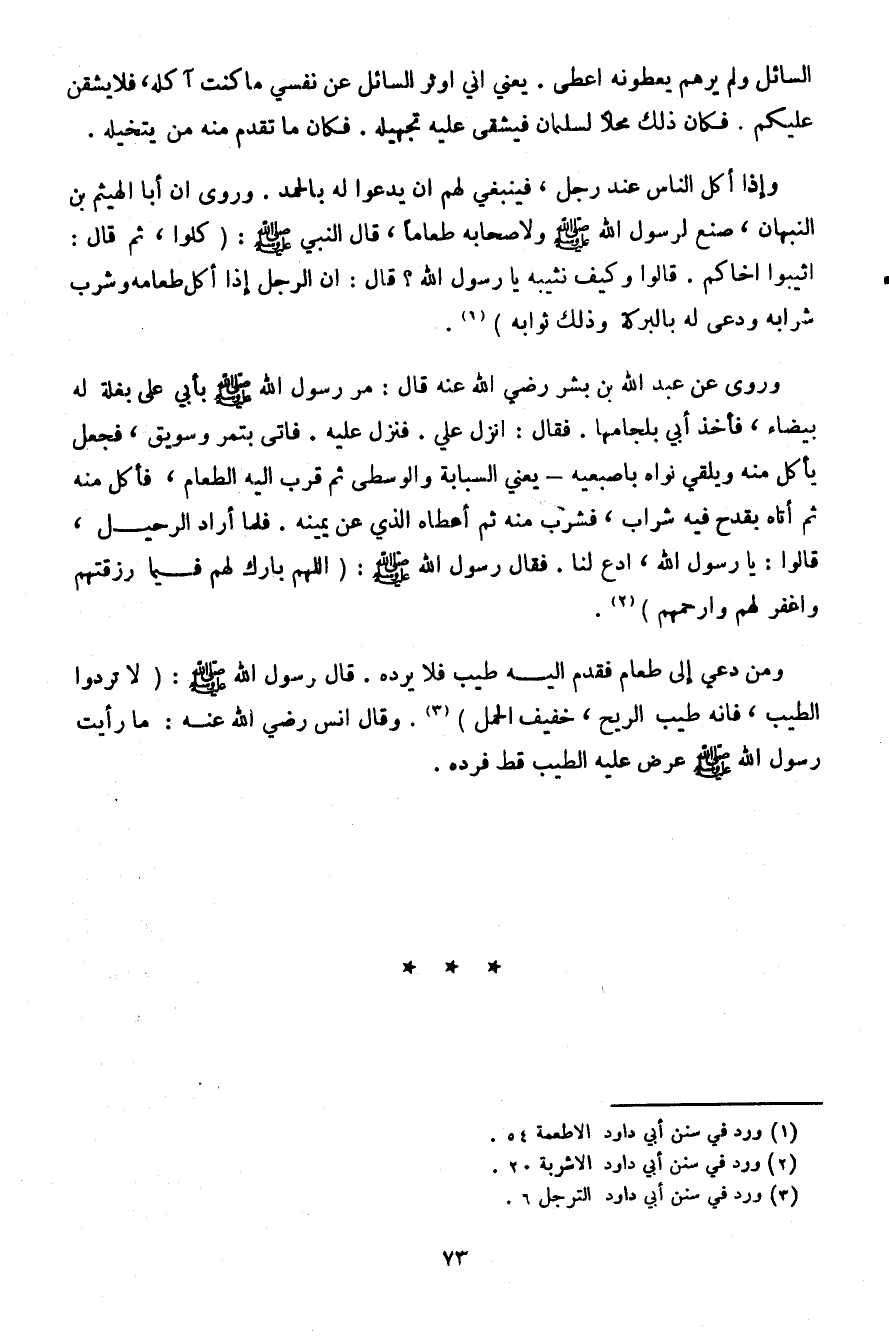 وإذا أكل الناس عند رجل، فينبغي لهم أن يدعوا له بالحمد. وروى أن أبا الهيثم بن النبهان، صنع لرسول الله صلى الله عليه وسلم ولأصحابه طعاما، قال النبي صلى الله عليه وسلم: (كلوا: ثم قال: أثيبوا أخاكم. قالوا وكيف نثيبه يا رسول الله؟ قال: إن الرجل إذا أكل طعامه وشرب شرابه ودعى له بالبركة وذلك ثوابه).