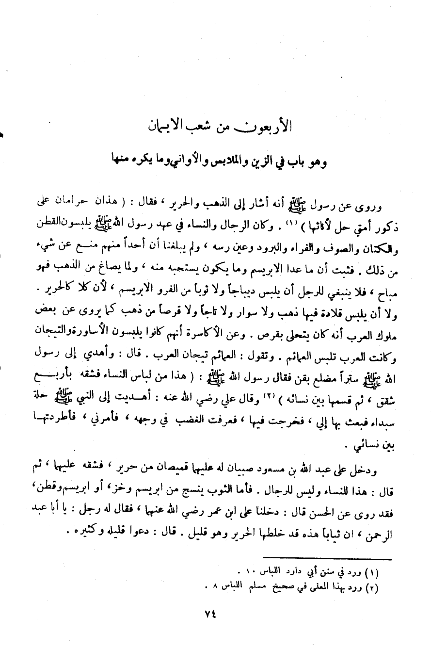 وروي عن رسول الله صلى الله عليه وسلم أنه أشار إلى الذهب والحرير، فقال: (هذا حرامان على ذكور أمتي حل لأنائها). وكان الرجال والنساء في عهد رسول الله صلى الله عليه وسلم يلبسون القطن والكتان والصوف والفراء والبرود وعين رسه، ولم يبلغنا أن أحدا منهم منع عن شيء من ذلك. فثبت أن ماعدا الابريسم وما يكون يستحبه منه، ولما يصاغ من الذهب فهو مباح، فلا ينبغي للرجل أن يلبس ديباجا ولا ثوبا من الفرو الابريسم، لأن كلا كالحرير. ولا أن يلبس قلادة فيها ذهب ولا سوار ولا تاجا ولا قرصا من ذهب كما يروي عن بعض ملوك العرب أنه كان يتحلى بقرص. وعن الأكاسرة أنهم كانوا يلبسون الأساورة والتيجان وكانت العرب تلبس العمائم. وتقول: العمائم تيجان العرب. قال: وأهدي إلى رسول الله صلى الله عليه وسلم سترا مضلع بقن فقال رسول الله صلى الله عليه وسلم: (هذا من لباس النساء فشقه بأربع شقق، ثم قسمها بين نسائه) وقال علي رضي الله عنه: أهديت إلى النبي صلى الله عليه وسلم حلة سبداء فبعث بها إلي، فخرجت فيها، فعرفت الغضب في وجهه، فأمرني، فأطردتها بين نسائي.