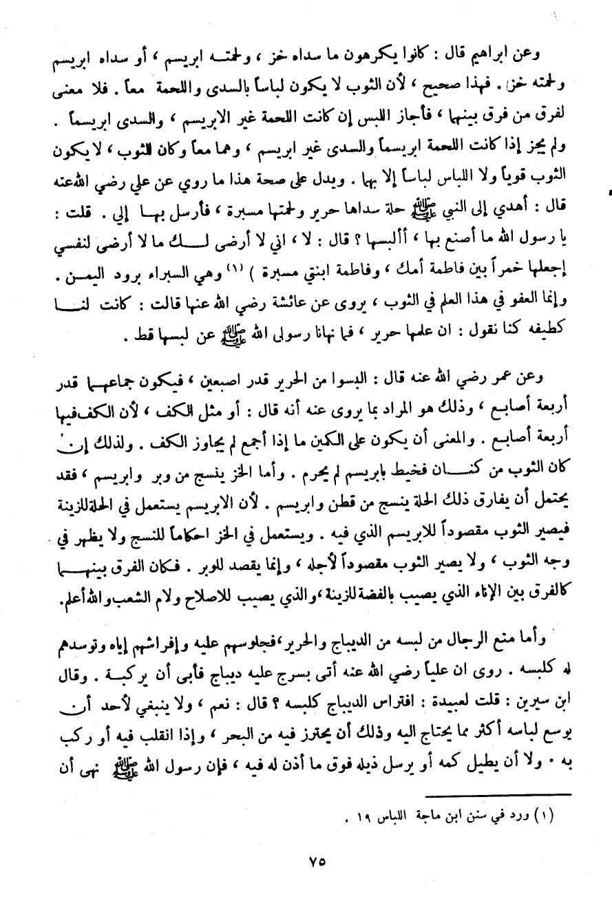 وعن إبراهيم قال: كانوا يكرهون ما سداه خز، ولحمته إبريسم، أو سداه إبريسم ولحمته خز. فهذا صحيح، لأن الثوب لا يكون لباسا بالسدى واللحمة معا. فلا معنى لفرق من فرق بينهما، فأجاز اللبس إن كانت اللحمة غير الابريسم، والسدى ابريسما. ولم يجز إذا كانت اللحمة إبريسما والسدى غير إبريسم، وهما معا وكان الثوب، لا يكون الثوب قويا ولا اللباس لباسا إلا بهما. ويدل على صحة هذا ما روي عن علي رضي الله عنه قال: أهدي إلى النبي صلى الله عليه وسلم حلة سداها حرير ولحمتها مسبرة، فأرسل بها إلي، قلت: يا رسول الله ما أصنع بها، أألبسها؟ قال: لا، إني لا أرضى لك ما لا أرضى لنفسي إجعلها خمرا بين فاطمة أمك، وفاطمة ابنتي مسبرة) وهي السبراء برود اليمن. وإنما العفو في هذا العلم في الثوب، يروي عن عائشة رضي الله عنها قالت: كانت لنا كطيفه كنا نقول: إن علمها حرير، فما نهانا رسول الله صلى الله عليه وسلم عن لبسها قط.