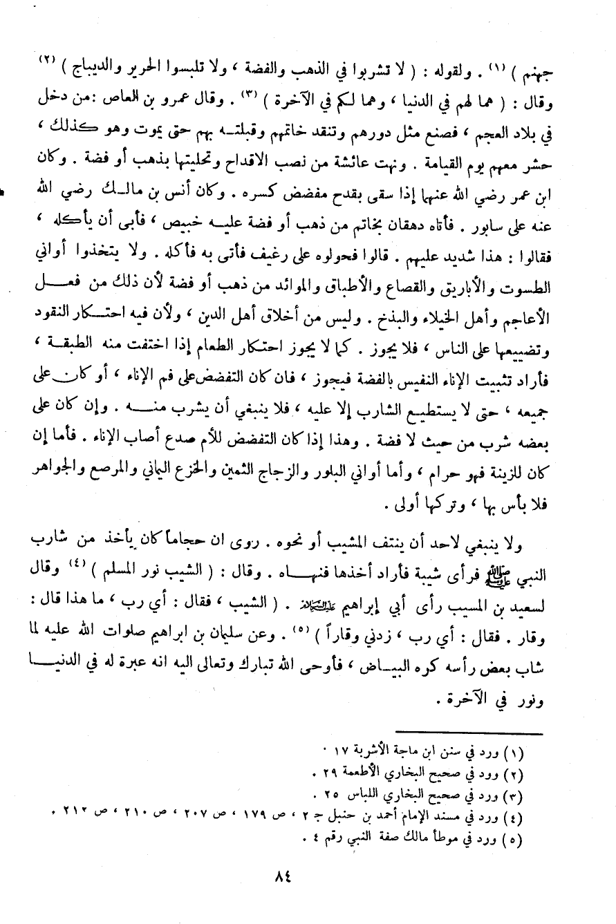 جهنم). ولقوله: (لا تشربوا في الذهب والفضة، ولا تلبسوا الحرير والديباج) وقال: (هما لهم في الدنيا، وهما لكم في الآخرة). وقال عمرو بن العاص: من دخل في بلاد العجم، فصنع مثل دورهم وتنقد خاتمهم وقبلته بهم حتى يموت وهو كذلك، حشر معهم يوم القيامة. ونهت عائشة من نصب الأقداح وتحليتها بذهب أو فضة. وكان ابن عمر رضي الله عنهما إذا سقى بقدح مفضض كسره. وكان أنس بن مالك رضي الله عنه على سابور. فأتاه دهقان بخاتم من ذهب أو فضة عليه خبيص، فأبى أن يأكله، فقالوا: هذا شديد عليهم. قالوا فحلوه على رغيف فأتى به فأكله. ولا يتخذوا أواني الطسوت والأباريق والقصاع والأطباق والموائد من ذهب أو فضة لأن ذلك من فعل الأعاجم وأهل الخيلاء والبذخ. وليس من أخلاق أهل الدين، ولأن فيه احتكار النقود وتضييعها على الناس، فلا يجوز. كما لا يجوز احتكار الطعام إذا اختفت منه الطبقة، فأراد تثبيت الإناء النفيس بالفضة فيجوز، فإن كان التفضض على فم الإناء، أو كان على جميعه، حتى لا يستطيع الشارب إلا عليه، فلا ينبغي أن يشرب منه. وإن كان على بعضه شرب من حيث لا فضة. وهذا إذا كان التفضض للام صدع أصاب الإناء. فأما إن كان للزينة فهو حرام، وأما أواني البلور والزجاج الثمين والخزع اليماني والمرصع والجواهر فلا بأس بها، وتركها أولى.