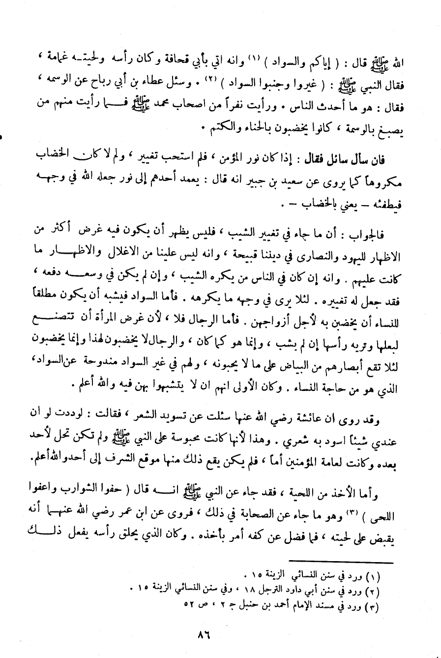 فإن سئل سائل فقال: إذا كان نور المؤمن، فلم استحب تغيير، ولم لا كان الخضاب مكروها كما يروي عن سعيد ين جبير أنه قال: يعمد أحدهم إلى نور جعله الله في وجهه فيطفئه- يعني بالخضاب.