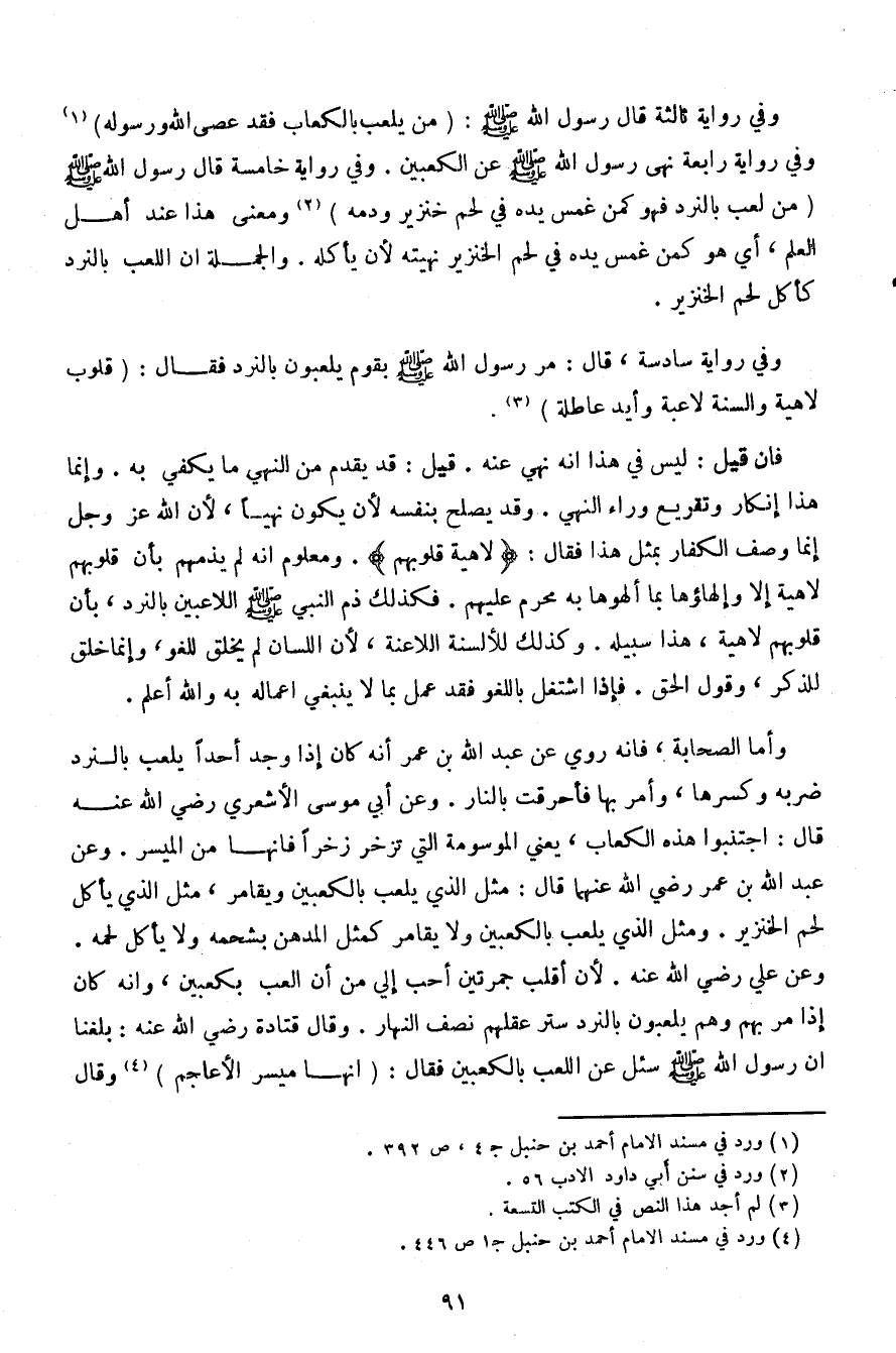 وفي رواية ثالثة قال رسول الله صلى الله عليه وسلم: (من يلعب بالكعاب فقد عصى الله ورسوله) وفي رواية رابعة نهى رسول الله صلى الله عليه وسلم عن الكعبين. وفي رواية خاامسة قال رسول الله صلى الله عليه وسلم (من لعب بالنرد فهو كمن غمس يده في لحم خنزير ودمه) ومعنى هذا عند أهل العلم، أي هو ككمن غمس سده في لحم الخنزير نهيته لأن يأكله. والجملة أن اللعب بالنرد كأكل لحم الخنزير.