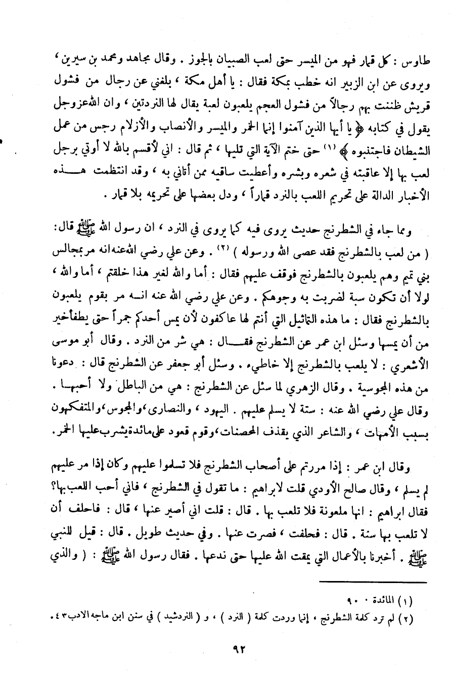 ومما جاء في الشطرنح حديث يروي فيه كا يروي في النرد، أن رسول الله صلى الله عليه وسلم قال: (من لعب بالشطرنج فقد عصى الله ورسوله). وعن علي رضي الله عنه أنه مر بمجالس بني تميم وهم يلعبون بالشطرنح فوقف عليهم فقال: أما والله لغير هذا خلقتم، أما والله، لولا أن تكون سبة لضربت به وجوهكم. وعن علي رضي الله عنه أنه مر بقوم يلعبون بالشطرنج فقال: ما هذه التماثيل التي أنتم لها عاكفون لأن يمس أحدكم جمرا حتى يطفأ خير من أن يمسها وسئل ابن عمر عن الشطرنج فقال: هي شر من النرد. وقال أبو موسى الأشعري: لا يلعب بالشطرنج إلا خاطئ. وسئل أبو جعفر عن الشطرنج قال: دعونا من هذه المجوسية. وقال الزهري لما سئل عن الشطرنج: هي من الباطل ولا أحبها. وقال علي رضي الله عنه: ستة لا يسلم عليهم. اليهود، والنصارى، والمجوس، والمتفكهون بسبب الأمهات، والشاعر الذي يقذف المحصنات، قوم قعود على مائدة يشرب عليها الخمر.