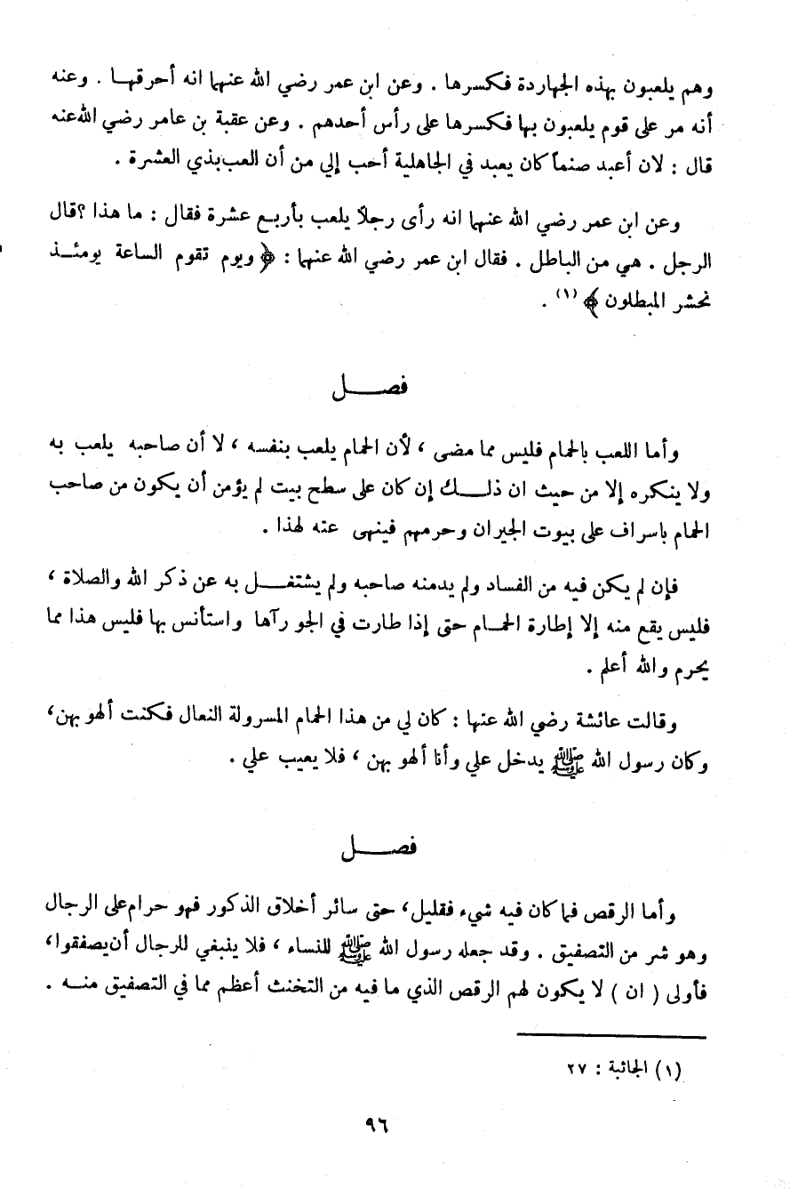 وأما الرقص فما كان فيه شيء فقليل، حتى سائر أخلاق الذكور فهو حرام على الرجال وهو شر من التصفيق. وقد جعله رسول الله صلى الله عليه وسلم للنساء، فلا ينبغي للرجال أن يصفقوا، فأولى (أن) لا يكون لهم الرقص الذي ما فيه من التخنث أعظم مما في التصفيق منه.