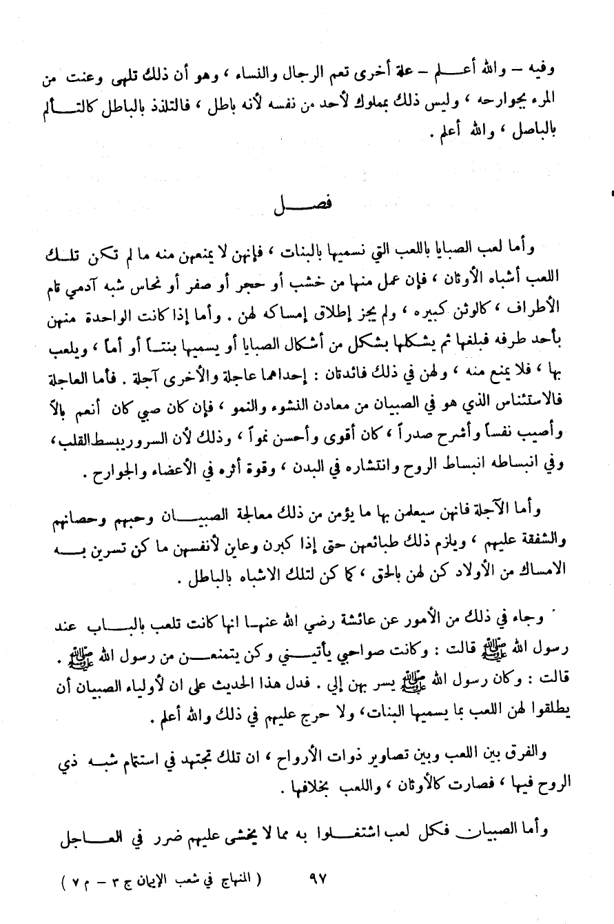 وأما لعب الصبايا باللعب التي نسميها بالبنات، فإنهن لا يمنعهن منه ما لم تكن تلك اللعب أشباه الأوثان، فإن عمل منه من خشب أو حجر أو صفر أو نحاس شبه آدمي تام الأطراف، كالوثن كبيره، ولم يجز إطلاق إمساكه لهن. وأما إذا كانت الواحدة منهن بأحد طرفه فبلغها ثم يشكلها بشكل من أشكال الصبايا أو يسميها بنتا أو أما، ويلعب بها، فلا يمنع منه، ولهن في ذلك فائدتان: إحداهما عاجلة والأخرى آجلة. فأما العاجلة فالاستئناس الذي هو في الصبيان من معادن النشوء والنمو، فإن كان صبي كان أنعم بالا أصيب نفسا وأشرح صدرا، كان أقوى وأحسن نموا، وذلك لأن السرور يبسط القلب، وفي انبساطه انبساط الروح وانتشاره في البدن، وقوة أثره في الأعضاء والجوارح.