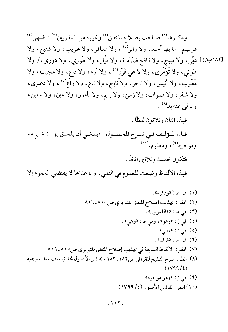 (٨) انظر: شرح التنقيح للقرافي ص ١٨٢ - ١٨٣، نفائس الأصول تحقيق عادل عبد الموجود (٤/ ١٧٩٩).
