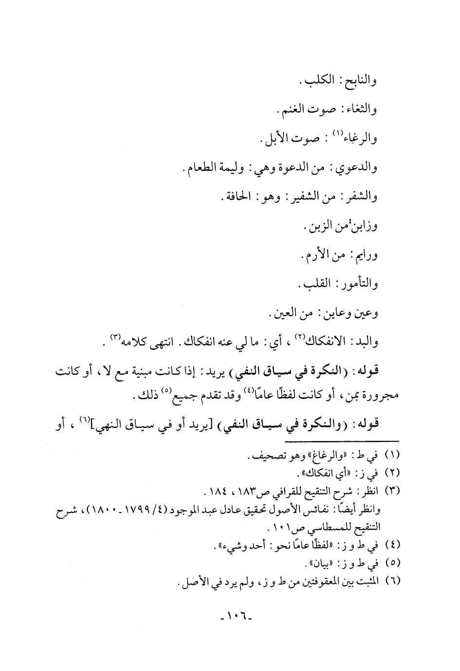 قوله: (النكرة في سياق النفي) يريد: إذا كانت مبنية مع لا، أو كانت مجرورة بمن، أو كانت لفظًا عامًا (٤) وقد تقدم جميع (٥) ذلك.