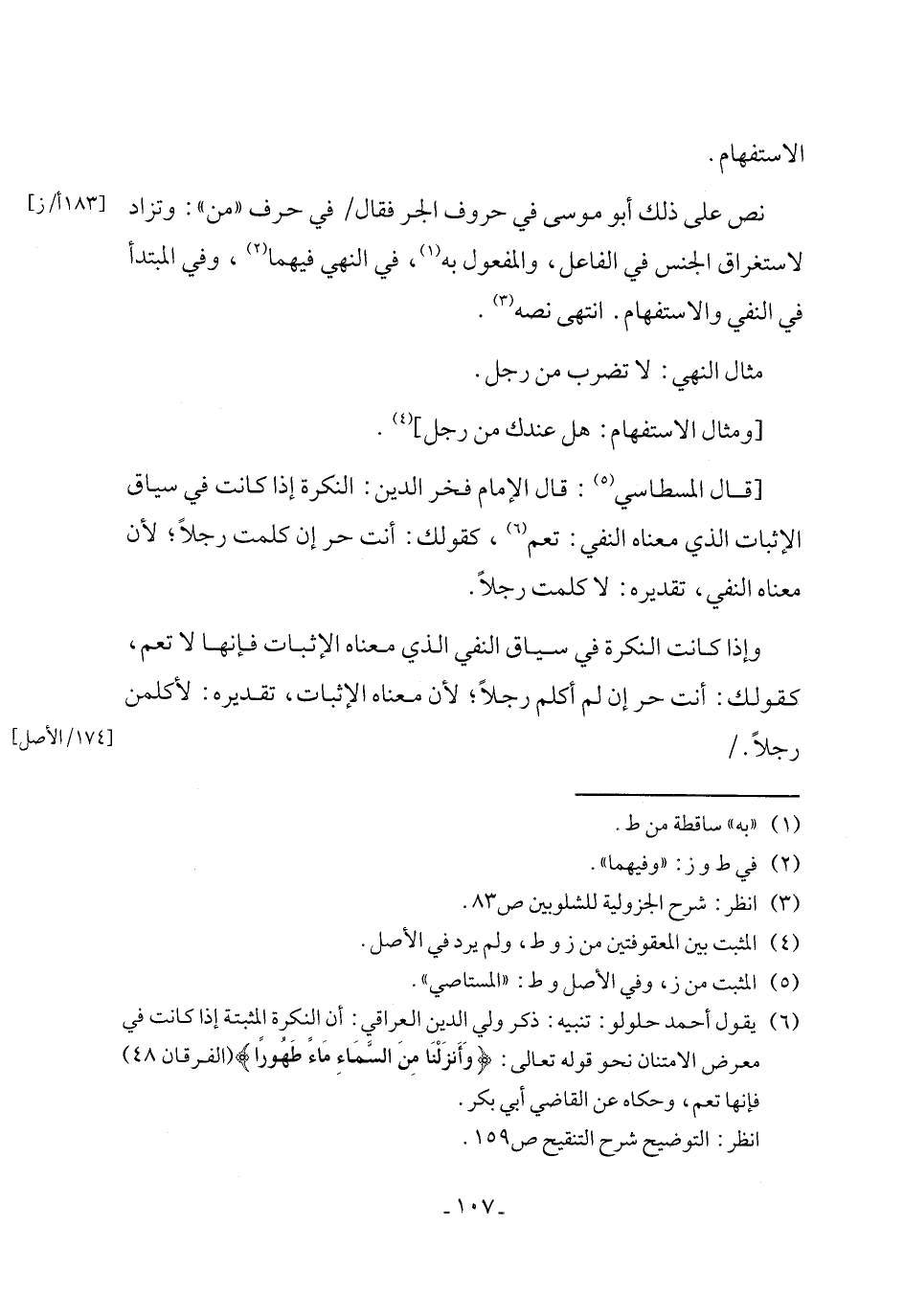(٦) يقول أحمد حلولو: تنبيه: ذكر ولي الدين العراقي: أن النكرة المثبتة إذا كانت في معرض الامتنان نحو قوله تعالى: {وَأَنزَلْنَا مِنَ السَّمَاءِ مَاءً طَهُورًا} (الفرقان ٤٨) فإنها تعم، وحكاه عن القاضي أبي بكر.