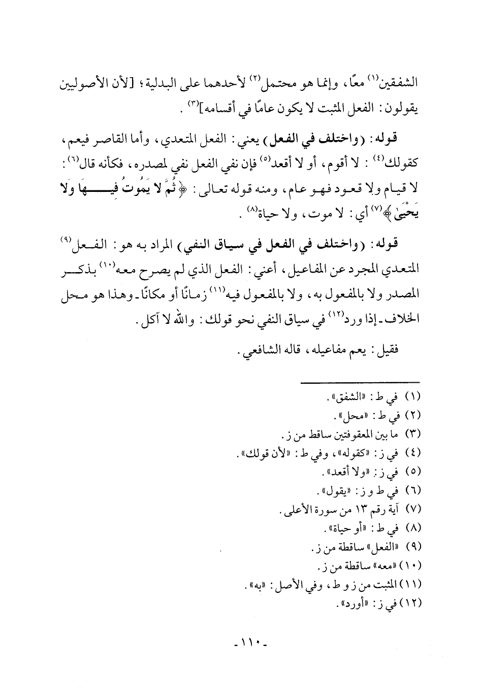 قوله: (واختلف في الفعل) يعني: الفعل المتعدي، وأما القاصر فيعم، كقولك (٤): لا أقوم، أو لا أقعد (٥) فإن نفي الفعل نفي لمصدره، فكأنه قال (٦): لا قيام ولا قعود فهو عام، ومنه قوله تعالى: {ثُمَ لا يَمُوتُ فِيهَا وَلا يَحْيَى} (٧) أي: لا موت، ولا حياة (٨).
