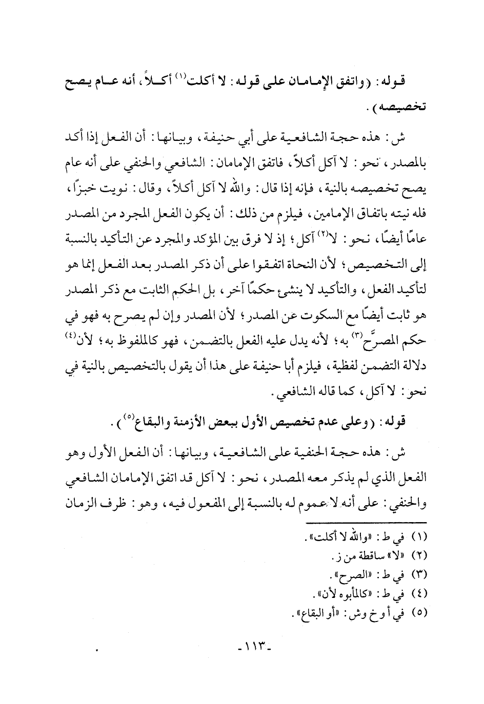 ش: هذه حجة الشافعية على أبي حنيفة، وبيانها: أن الفعل إذا أكد بالمصدر، نحو: لا آكل أكلًا، فاتفق الإمامان: الشافعي والحنفي على أنه عام يصح تخصيصه بالنية، فإنه إذا قال: والله لا آكل أكلًا، وقال: نويت خبزًا، فله نيته باتفاق الإمامين، فيلزم من ذلك: أن يكون الفعل المجرد من المصدر عامًا أيضًا، نحو: لا (٢) آكل؛ إذ لا فرق بين المؤكد والمجرد عن التأكيد بالنسبة إلى التخصيص؛ لأن النحاة اتفقوا على أن ذكر المصدر بعد الفعل إنما هو لتأكيد الفعل، والتأكيد لا ينشئ حكمًا آخر، بل الحكم الثابت مع ذكر المصدر هو ثابت أيضًا مع السكوت عن المصدر؛ لأن المصدر وإن لم يصرح به فهو في حكم المصرَّح (٣) به؛ لأنه يدل عليه الفعل بالتضمن، فهو كالملفوظ به؛ لأن (٤) دلالة التضمن لفظية، فيلزم أبا حنيفة على هذا أن يقول بالتخصيص بالنية في نحو: لا آكل، كما قاله الشافعي.