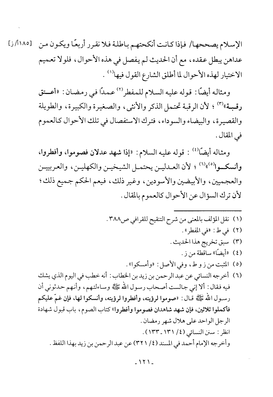 ومثاله أيضًا: قوله عليه السلام للمفطر (٢) عمدًا في رمضان: "أعتق رقبة" (٣)؛ لأن الرقبة تحتمل الذكر والأنثى، والصغيرة والكبيرة، والطويلة والقصيرة، والبيضاء والسوداء، فترك الاستفصال في تلك الأحوال كالعموم في المقال.