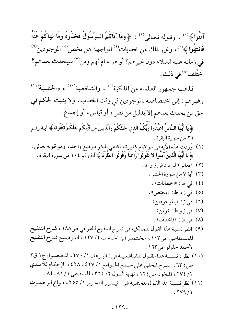 (٩) انظر نسبة هذا القول للمالكية في شرح التنقيح للقرافي ص ١٨٨، شرح التنقيح للمسطاسي ص ١٠٣، مختصر ابن الحاجب ٢/ ١٢٧، التوضيح شرح التنقيح لأحمد حلولو ص ١٦٣.