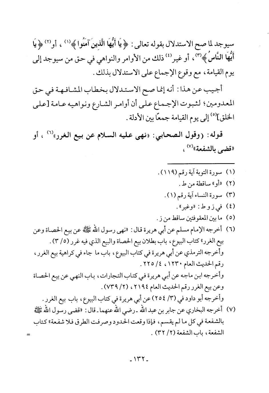 (٧) أخرجه البخاري عن جابر بن عبد الله - رضي الله عنهما - قال: "قضى رسول الله - صلى الله عليه وسلم - بالشفعة في كل ما لم يقسم، فإذا وقعت الحدود وصرفت الطرق فلا شفعة" كتاب الشفعة، باب الشفعة (٢/ ٣٢). =