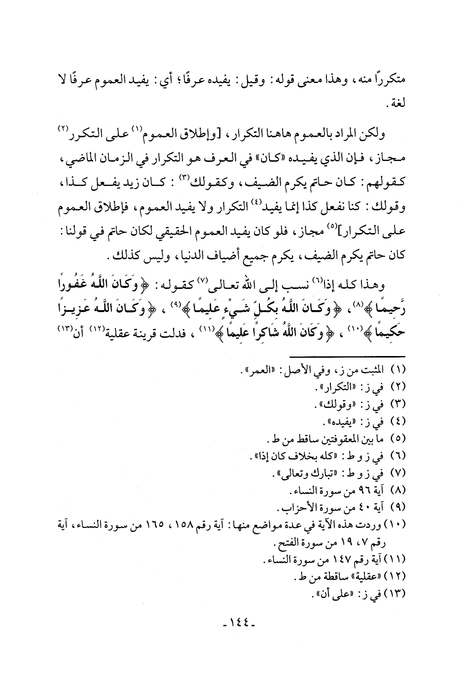 ولكن المراد بالعموم ها هنا التكرار، [وإطلاق العموم (١) على التكرر (٢) مجاز، فإن الذي يفيده "كان" في العرف هو التكرار في الزمان الماضي، كقولهم: كان حاتم يكرم الضيف، وكقولك (٣): كان زيد يفعل كذا، وقولك: كنا نفعل كذا إنما يفيد (٤) التكرار ولا يفيد العموم، فإطلاق العموم على التكرار] (٥) مجاز، فلو كان يفيد العموم الحقيقي لكان حاتم في قولنا: كان حاتم يكرم الضيف، يكرم جميع أضياف الدنيا، وليس كذلك.