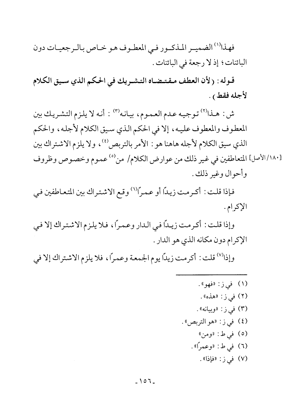 ش: هذا (٢) توجيه عدم العموم، بيانه (٣): أنه لا يلزم التشريك بين المعطوف والمعطوف عليه، إلا في الحكم الذي سيق الكلام لأجله، والحكم الذي سيق الكلام لأجله ها هنا هو: الأمر بالتربص (٤)، ولا يلزم الاشتراك بين المتعاطفين في غير ذلك من عوارض الكلام من (٥) عموم وخصوص وظروف وأحوال وغير ذلك.