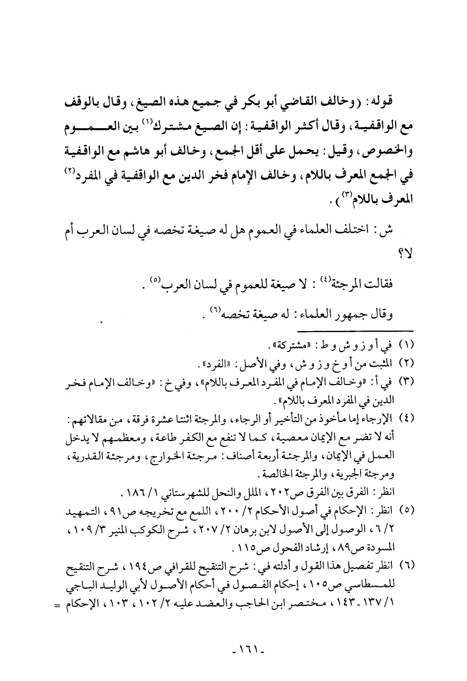 قوله: (وخالف القاضي أبو بكر في جميع هذه الصيغ، وقال بالوقف مع الواقفية، وقال أكثر الواقفية: إِن الصيغ مشترك (١) بين العموم والخصوص، وقيل: يحمل على أقل الجمع، وخالف أبو هاشم مع الواقفية في الجمع المعرف باللام، وخالف الإِمام فخر الدين مع الواقفية في المفرد (٢) المعرف باللام (٣)).