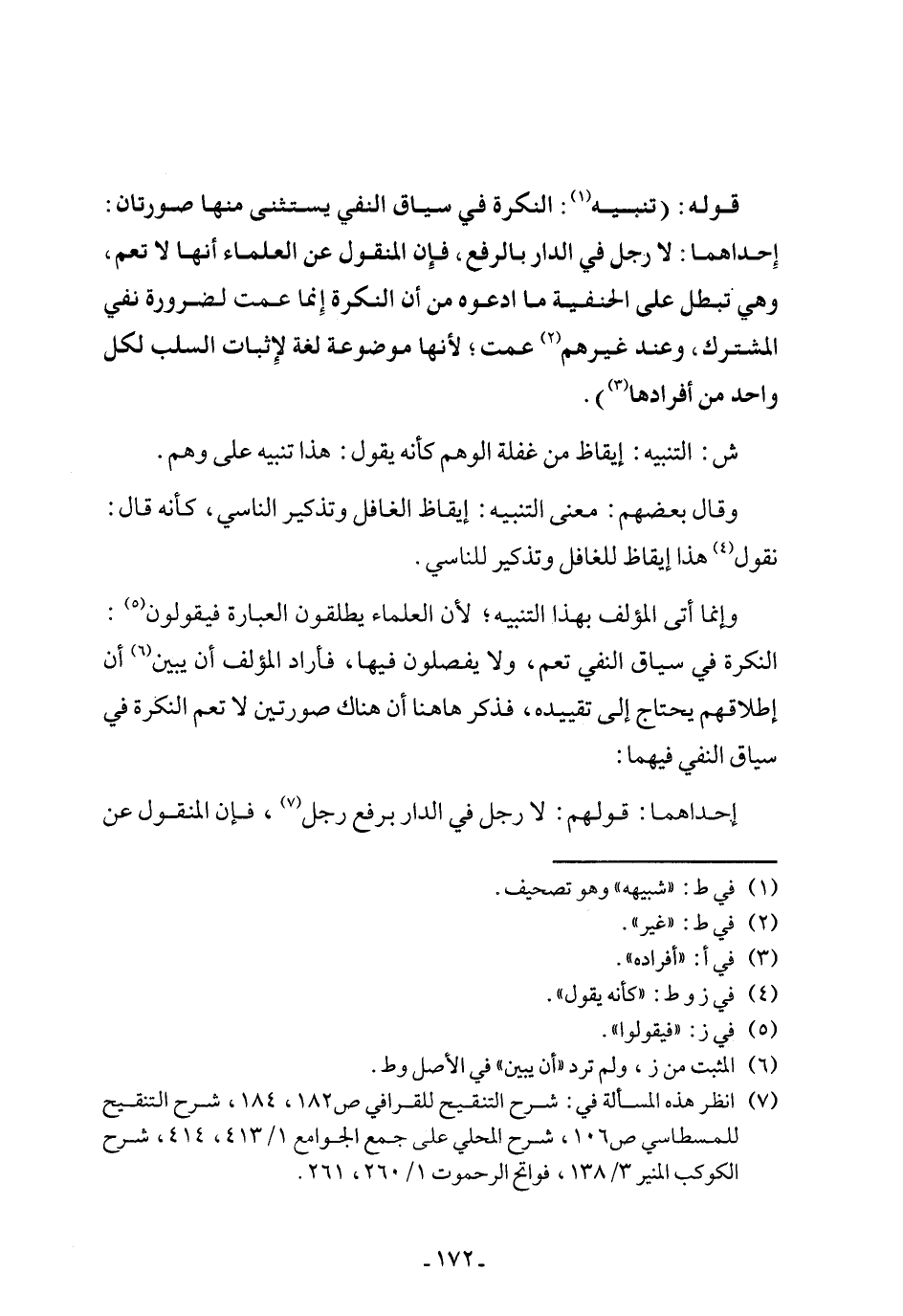 وإنما أتى المؤلف بهذا التنبيه؛ لأن العلماء يطلقون العبارة فيقولون (٥): النكرة في سياق النفي تعم، ولا يفصلون فيها، فأراد المؤلف أن يبين (٦) أن إطلاقهم يحتاج إلى تقييده، فذكر ها هنا أن هناك صورتين لا تعم النكرة في سياق النفي فيهما: