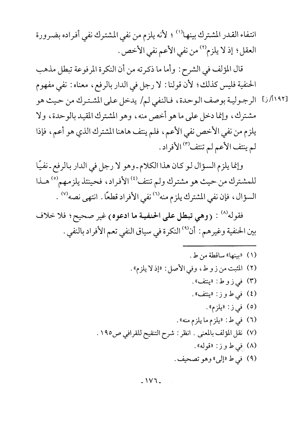قال المؤلف في الشرح: وأما ما ذكرته من أن النكرة المرفوعة تبطل مذهب الحنفية فليس كذلك؛ لأن قولنا: لا رجل في الدار بالرفع، معناه: نفي مفهوم الرجولية بوصف الوحدة، فالنفي لم يدخل على المشترك من حيث هو مشترك، وإنما دخل على ما هو أخص منه، وهو المشترك المقيد بالوحدة، ولا يلزم من نفي الأخص نفي الأعم، فلم ينتف ها هنا المشترك الذي هو أعم، فإذا لم ينتف الأعم لم تنتف (٣) الأفراد.