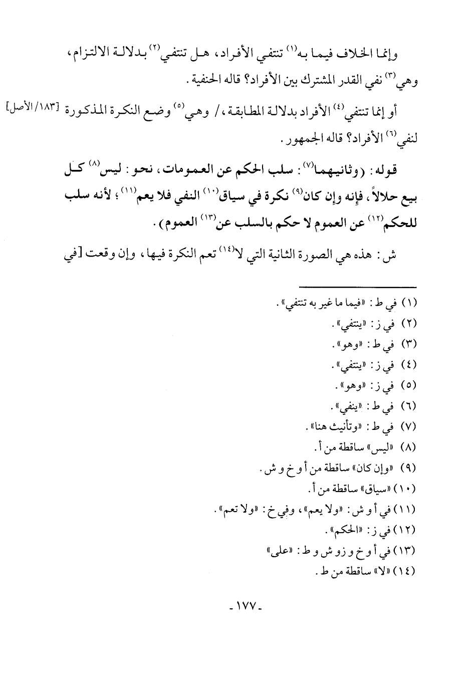 قوله: (وثانيهما (٧): سلب الحكم عن العمومات، نحو: ليس (٨) كل بيع حلالًا، فإِنه وإِن كان (٩) نكرة في سياق (١٠) النفي فلا يعم (١١)؛ لأنه سلب للحكم (١٢) عن العموم لا حكم بالسلب عن (١٣) العموم).