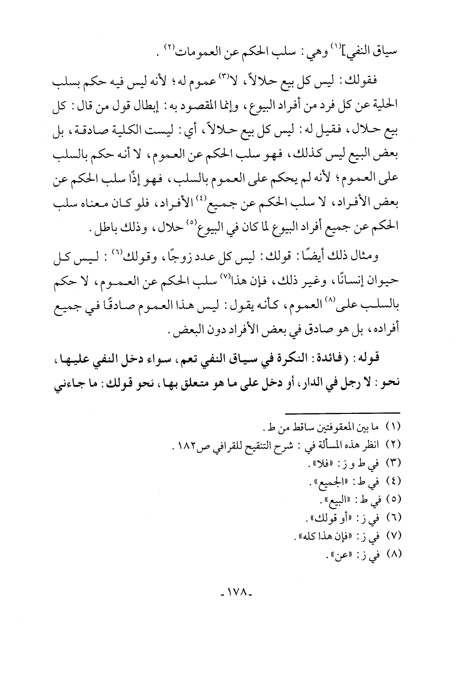 فقولك: ليس كل بيع حلالًا، لا (٣) عموم له؛ لأنه ليس فيه حكم بسلب الحلية عن كل فرد من أفراد البيوع، وإنما المقصود به: إبطال قول من قال: كل بيع حلال، فقيل له: ليس كل بيع حلالًا، أي: ليست الكلية صادقة، بل بعض البيع ليس كذلك، فهو سلب الحكم عن العموم، لا أنه حكم بالسلب على العموم؛ لأنه لم يحكم على العموم بالسلب، فهو إذًا سلب الحكم عن بعض الأفراد، لا سلب الحكم عن جميع (٤) الأفراد، فلو كان معناه سلب الحكم عن جميع أفراد البيوع لما كان في البيوع (٥) حلال، وذلك باطل.
