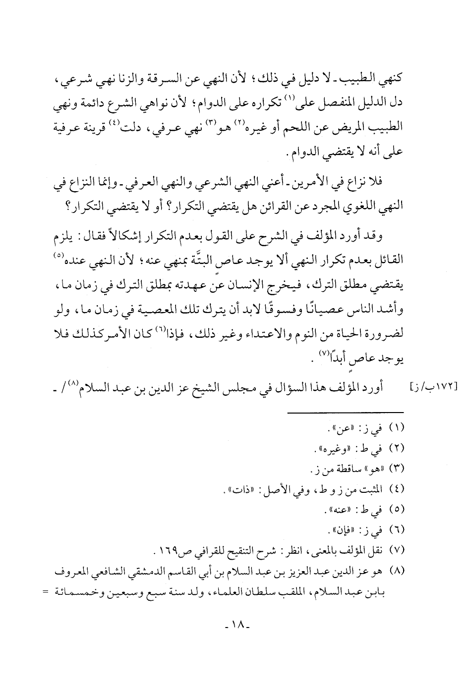 أورد المؤلف هذا السؤال في مجلس الشيخ عز الدين بن عبد السلام (٨)