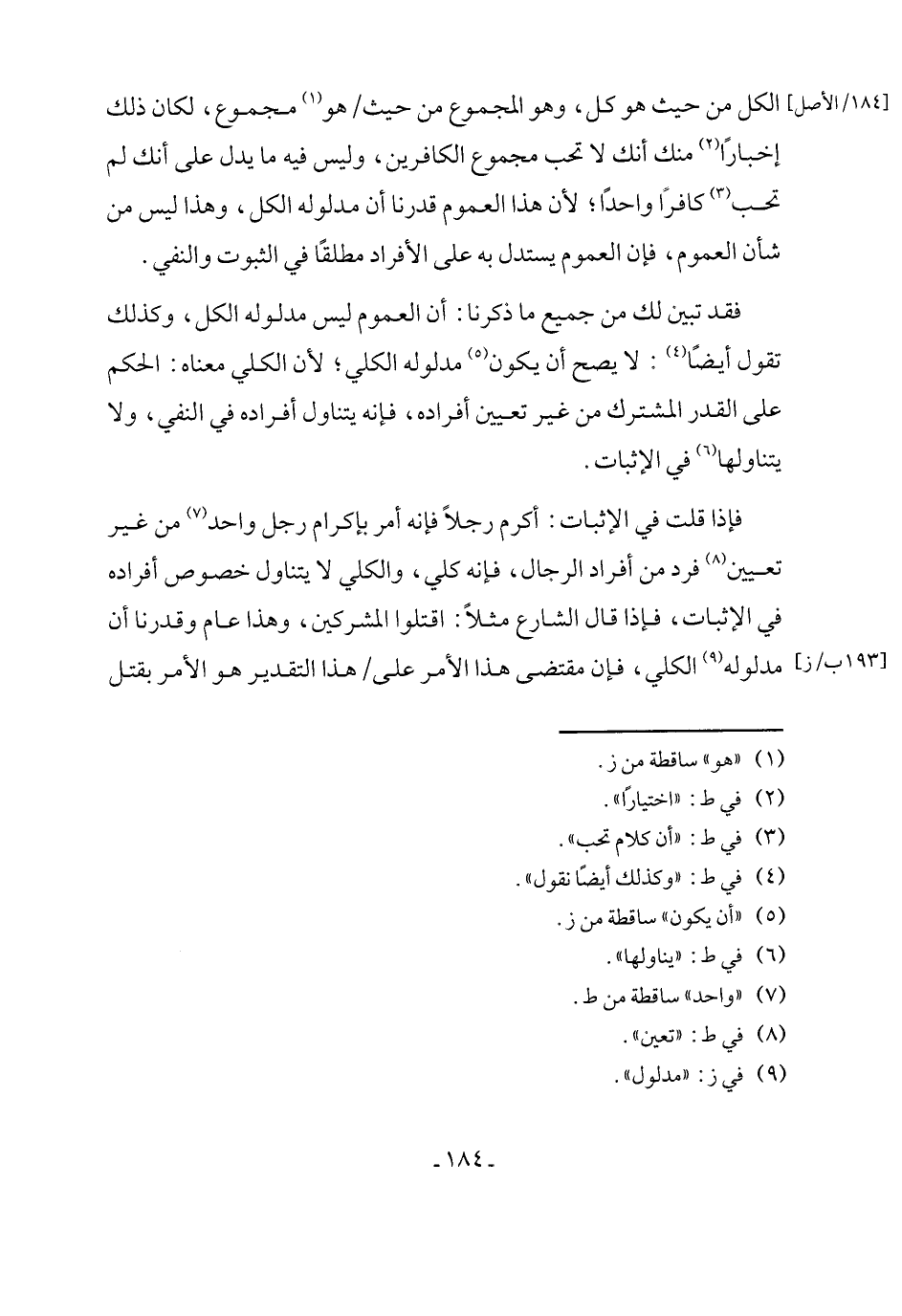 فإذا قلت في الإثبات: أكرم رجلًا فإنه أمر بإكرام رجل واحد (٧) من غير تعيين (٨) فرد من أفراد الرجال، فإنه كلي، والكلي لا يتناول خصوص أفراده في الإثبات، فإذا قال الشارع مثلًا: اقتلوا المشركين، وهذا عام وقدرنا أن مدلوله (٩) الكلي، فإن مقتضى هذا الأمر على هذا التقدير هو الأمر بقتل