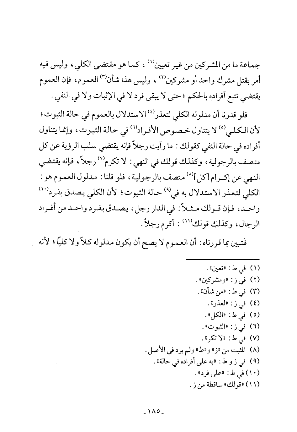 فلو قدرنا أن مدلوله الكلي لتعذر (٤) الاستدلال بالعموم في حالة الثبوت؛ لأن الكلي (٥) لا يتناول خصوص الأفراد (٦) في حالة الثبوت، وإنما يتناول أفراده في حالة النفي كقولك: ما رأيت رجلًا فإنه يقتضي سلب الرؤية عن كل متصف بالرجولية، وكذلك قولك في النهي: لا تكرم (٧) رجلًا، فإنه يقتضي النهي عن إكرام [كل] (٨) متصف بالرجولية، فلو قلنا: مدلول العموم هو: الكلي لتعذر الاستدلال به في (٩) حالة الثبوت؛ لأن الكلي يصدق بفرد (١٠) واحد، فإن قولك مثلًا: في الدار رجل، يصدق بفرد واحد من أفراد الرجال، وكذلك قولك (١١): أكرم رجلًا.