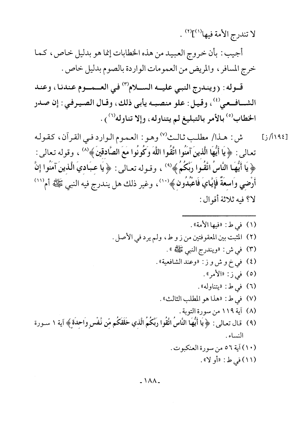ش: هذا مطلب ثالث (٧) وهو: العموم الوارد في القرآن، كقوله تعالى: {يَاأَيُّهَا الَّذِينَ آمَنُوا اتَّقُوا اللَّهَ وَكُونُوا مَعَ الصَّادِقِينَ} (٨)، وقوله تعالى: {يَاأَيُّهَا النَّاسُ اتَّقُوا رَبَّكُمُ} (٩)، وقوله تعالى: {يَاعِبَادِيَ الَّذِينَ آمَنُوا إِنَّ أَرْضِي وَاسِعَةٌ فَإِيَّايَ فَاعْبُدُونِ} (١٠)، وغير ذلك هل يندرج فيه النبي - صلى الله عليه وسلم - أم (١١) لا؟ فيه ثلاثة أقوال: