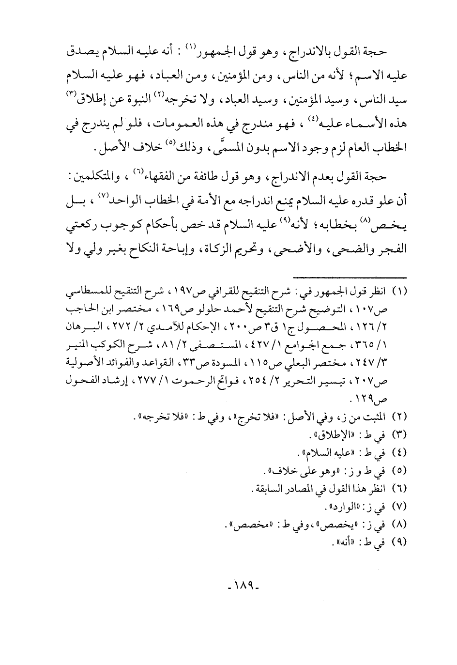 حجة القول بعدم الاندراج، وهو قول طائفة من الفقهاء (٦)، والمتكلمين: أن علو قدره عليه السلام يمنع اندراجه مع الأمة في الخطاب الواحد (٧)، بل يخص (٨) بخطابه؛ لأنه (٩) عليه السلام قد خص بأحكام كوجوب ركعتي الفجر والضحى، والأضحى، وتحريم الزكاة، وإباحة النكاح بغير ولي ولا