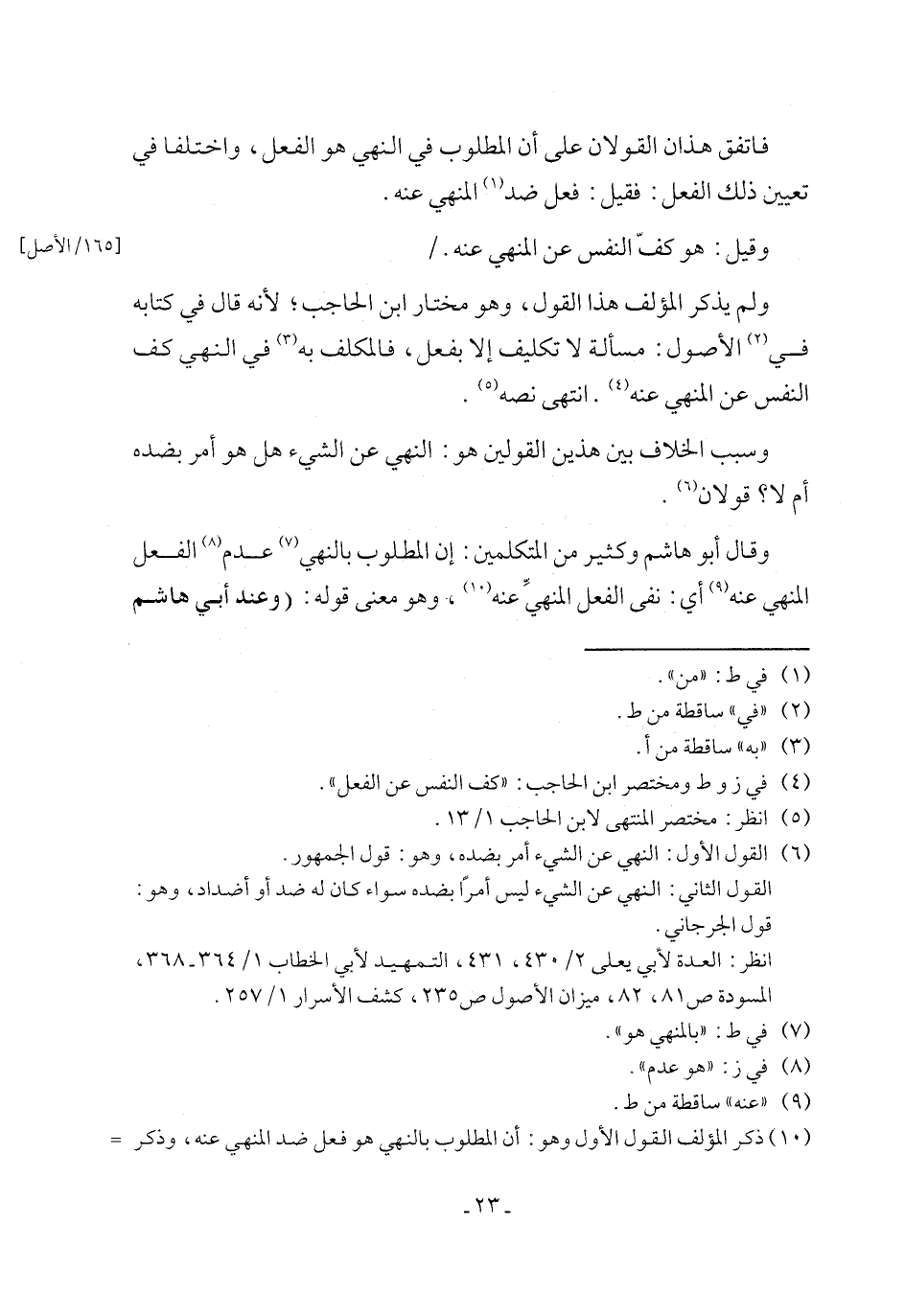 وقال أَبو هاشم وكثير من المتكلمين: إن المطلوب بالنهي (٧) عدم (٨) الفعل المنهي عنه (٩) أي: نفى الفعل المنهيِّ عنه (١٠)، وهو معنى قوله: (وعند أبي هاشم