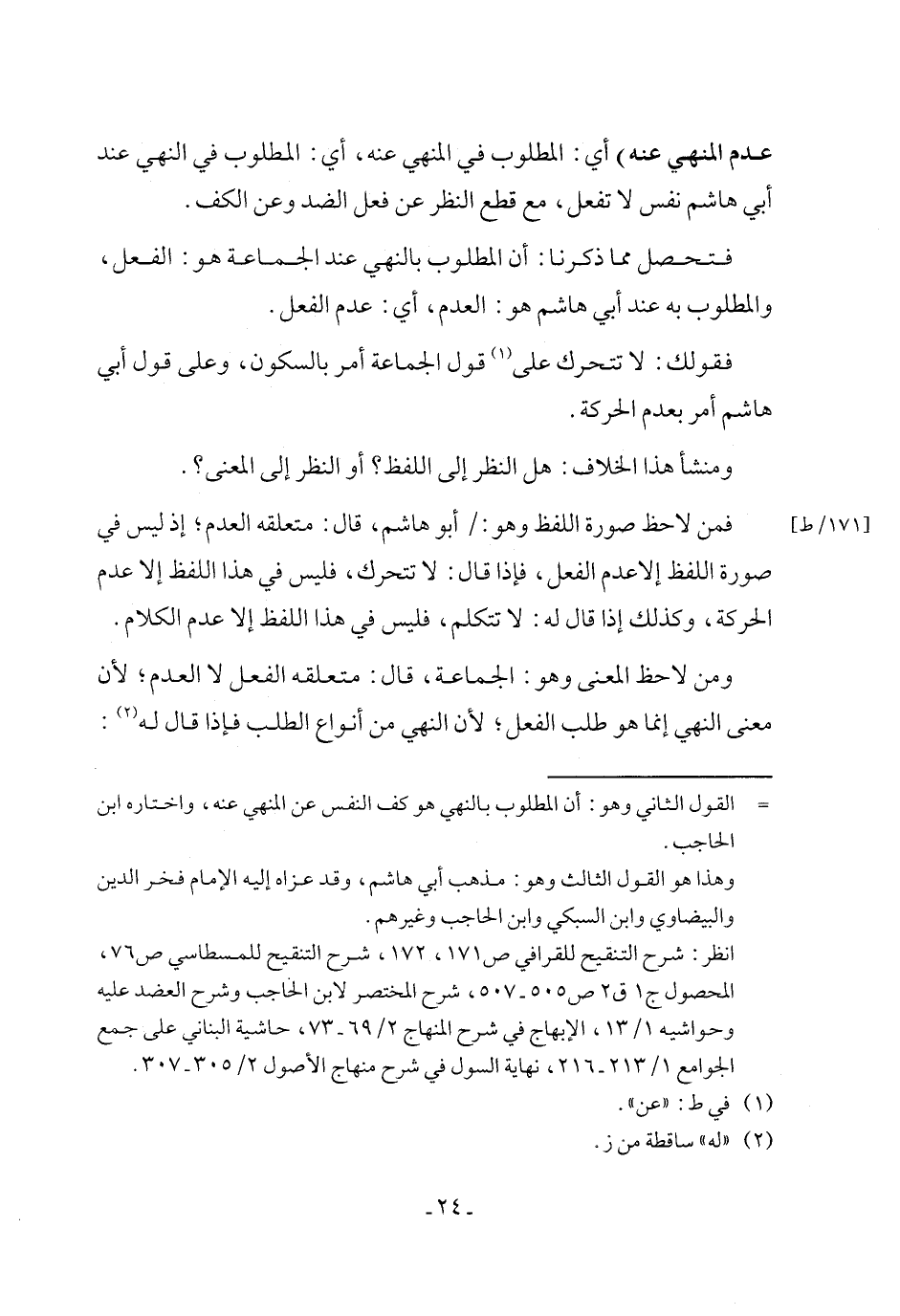 فمن لاحظ صورة اللفظ وهو: أَبو هاشم، قال: متعلقه العدم؛ إذ ليس في صورة اللفظ إلا عدم الفعل، فإذا قال: لا تتحرك، فليس في هذا اللفظ إلا عدم الحركة، وكذلك إذا قال له: لا تتكلم، فليس في هذا اللفظ إلا عدم الكلام.
