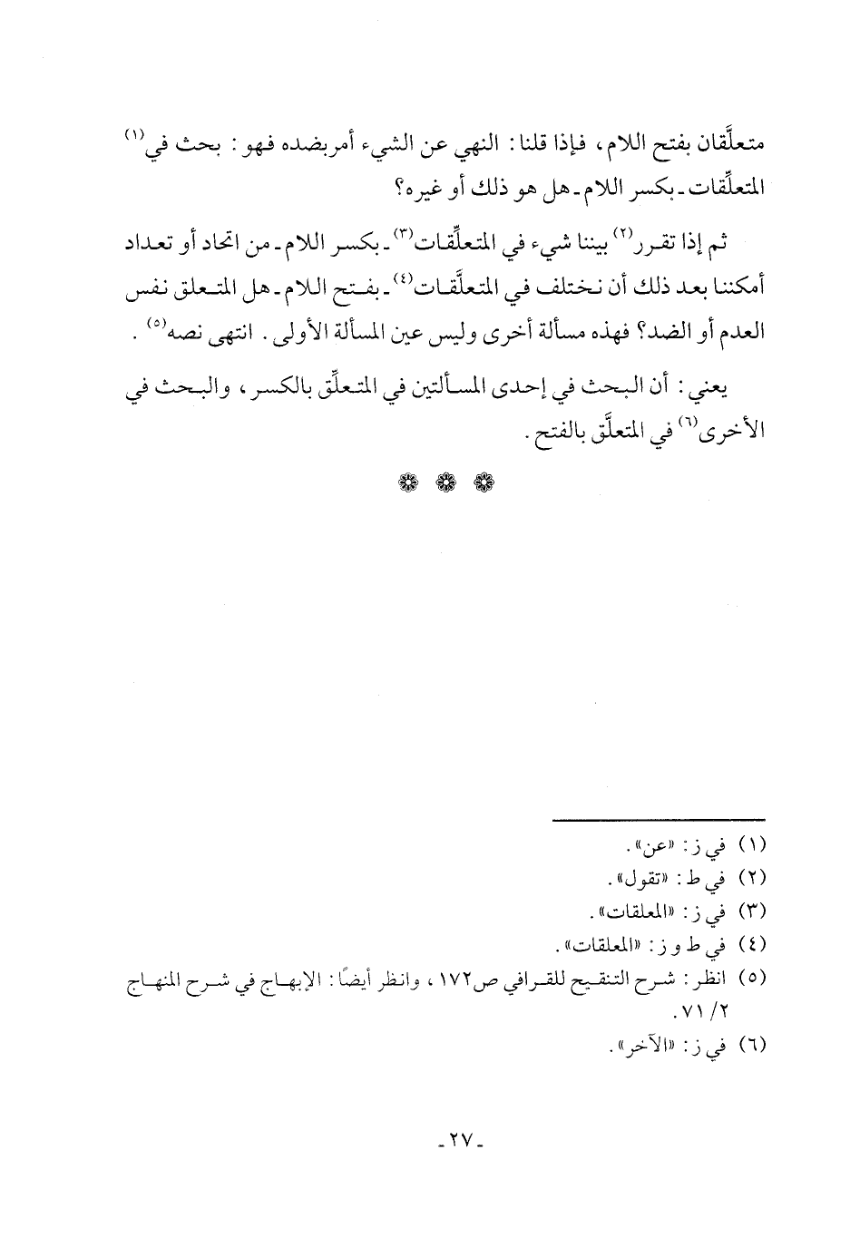 ثم إذا تقرر (٢) بيننا شيء في المتعلِّقات (٣) - بكسر اللام - من اتحاد أو تعداد أمكننا بعد ذلك أن نختلف في المتعلَّقات (٤) - بفتح اللام - هل المتعلق نفس العدم أو الضد؟ فهذه مسألة أخرى وليس عين المسألة الأولى. انتهى نصه (٥).