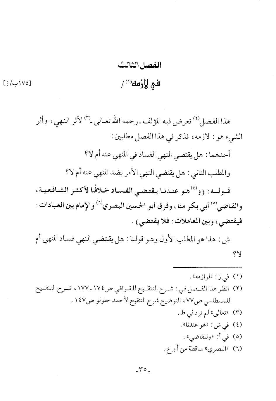 (٢) انظر هذا الفصل في: شرح التنقيح للقرافي ص ١٧٤ - ١٧٧، شرح التنقيح للمسطاسي ص ٧٧، التوضيح شرح التنقيح لأحمد حلولو ص ١٤٧.