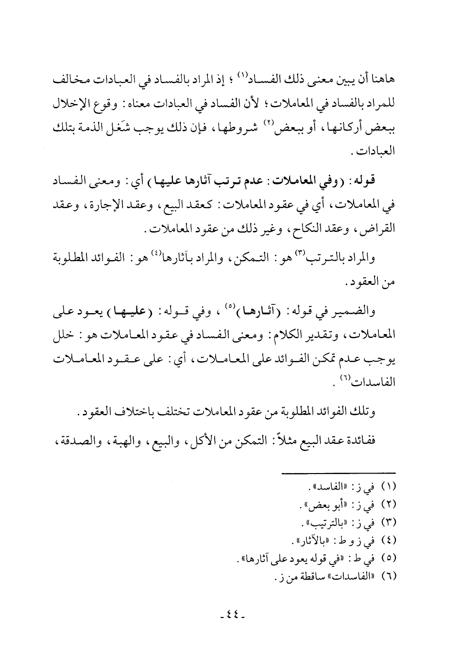 والضمير في قوله: (آثارها) (٥)، وفي قوله: (عليها) يعود على المعاملات، وتقدير الكلام: ومعنى الفساد في عقود المعاملات هو: خلل يوجب عدم تمكن الفوائد على المعاملات، أي: على عقود المعاملات الفاسدات (٦).
