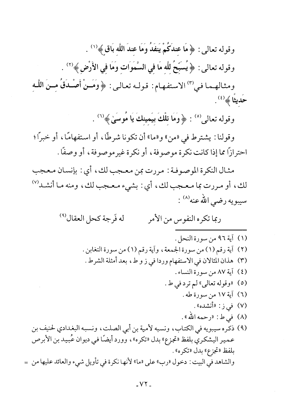 مثال النكرة الموصوفة: مررت بمن معجب لك، أي: بإنسان معجب لك، أو مررت بما معجب لك، أي: بشيء معجب لك، ومنه ما أنشد (٧) سيبويه رضي الله عنه (٨):
