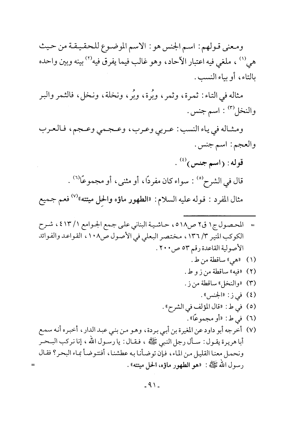 مثال المفرد: قوله عليه السلام: "الطهور ماؤه والحِل ميتته" (٧) فعم جميع